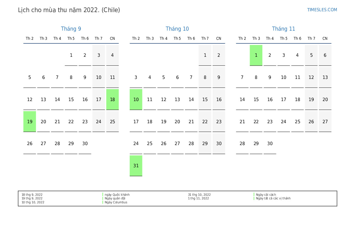 Vào mùa thu năm 2022, có 6 ngày nghỉ và ngày nghỉ trong nước chi Lê. Mùa thu năm 2022 bắt đầu vào thứ Năm và kết thúc vào thứ Tư.