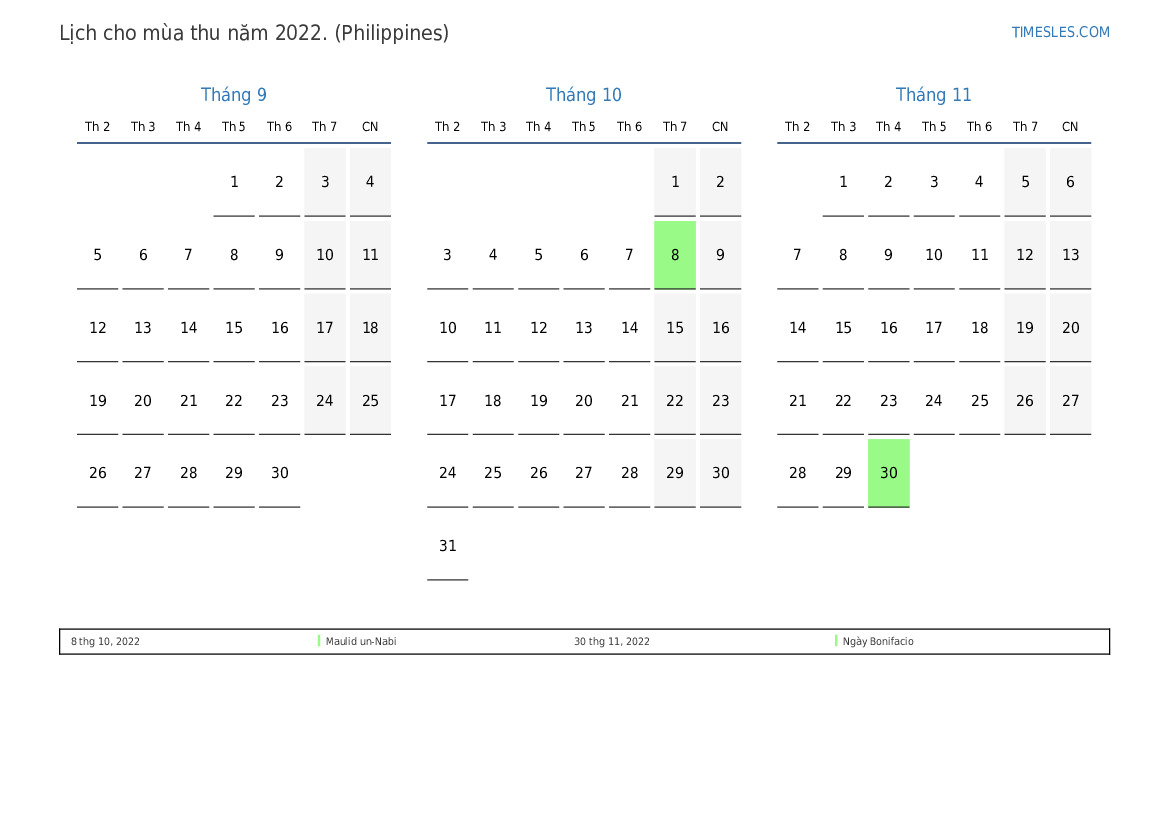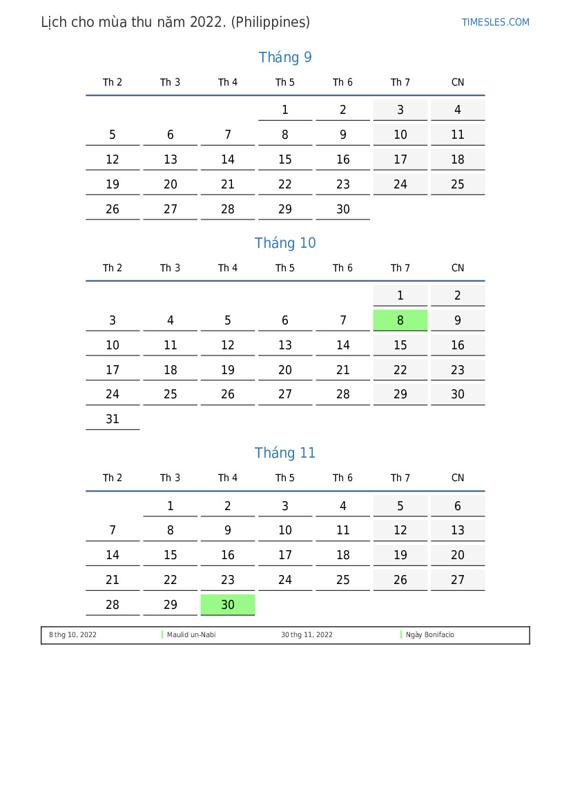 Tải xuống và in lịch PDF với các ngày lễ và cuối tuần cho mùa thu năm 2022 cho Philippines