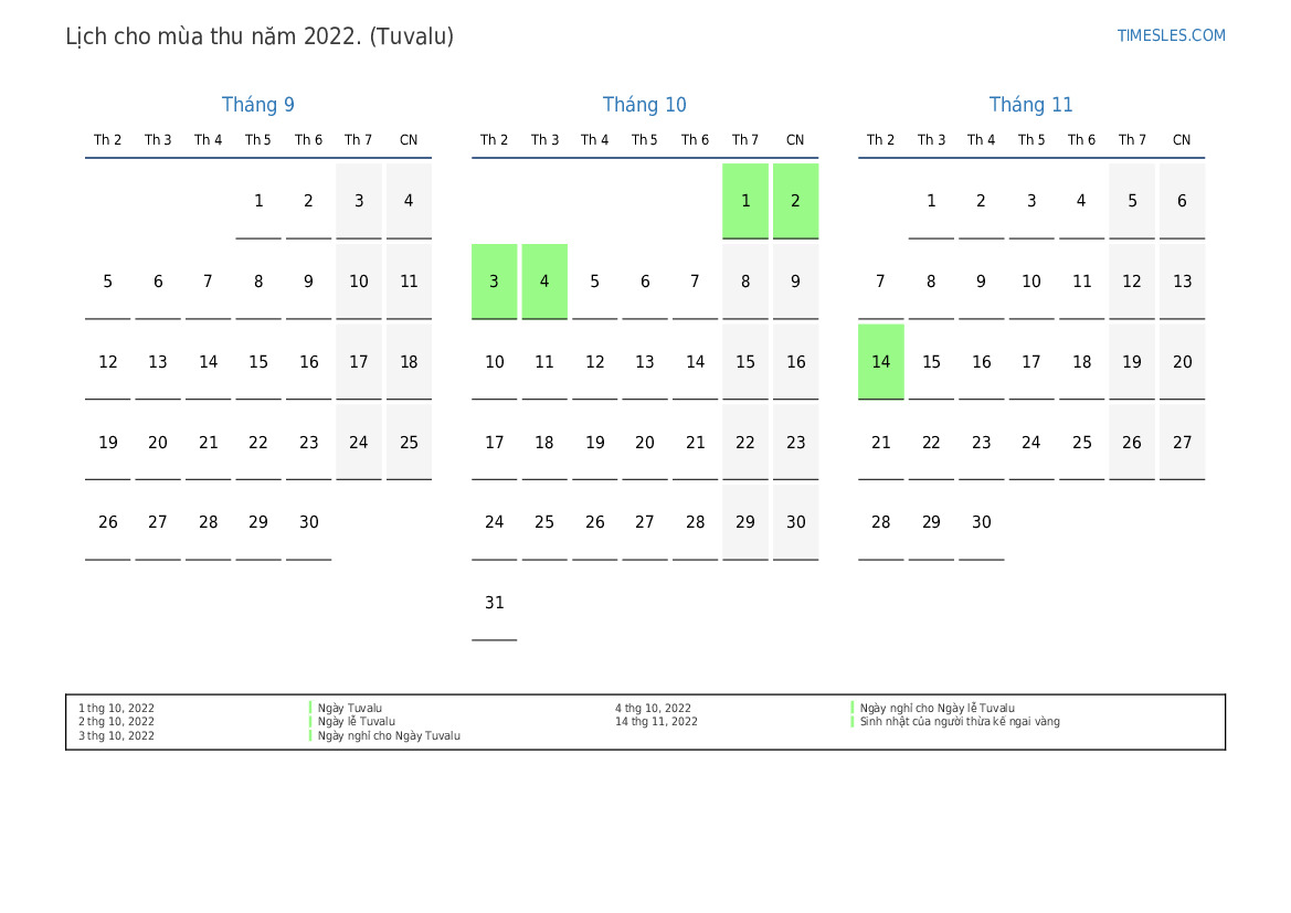 Lịch nghỉ lễ và cuối tuần cho mùa thu năm 2022 cho Tuvalu