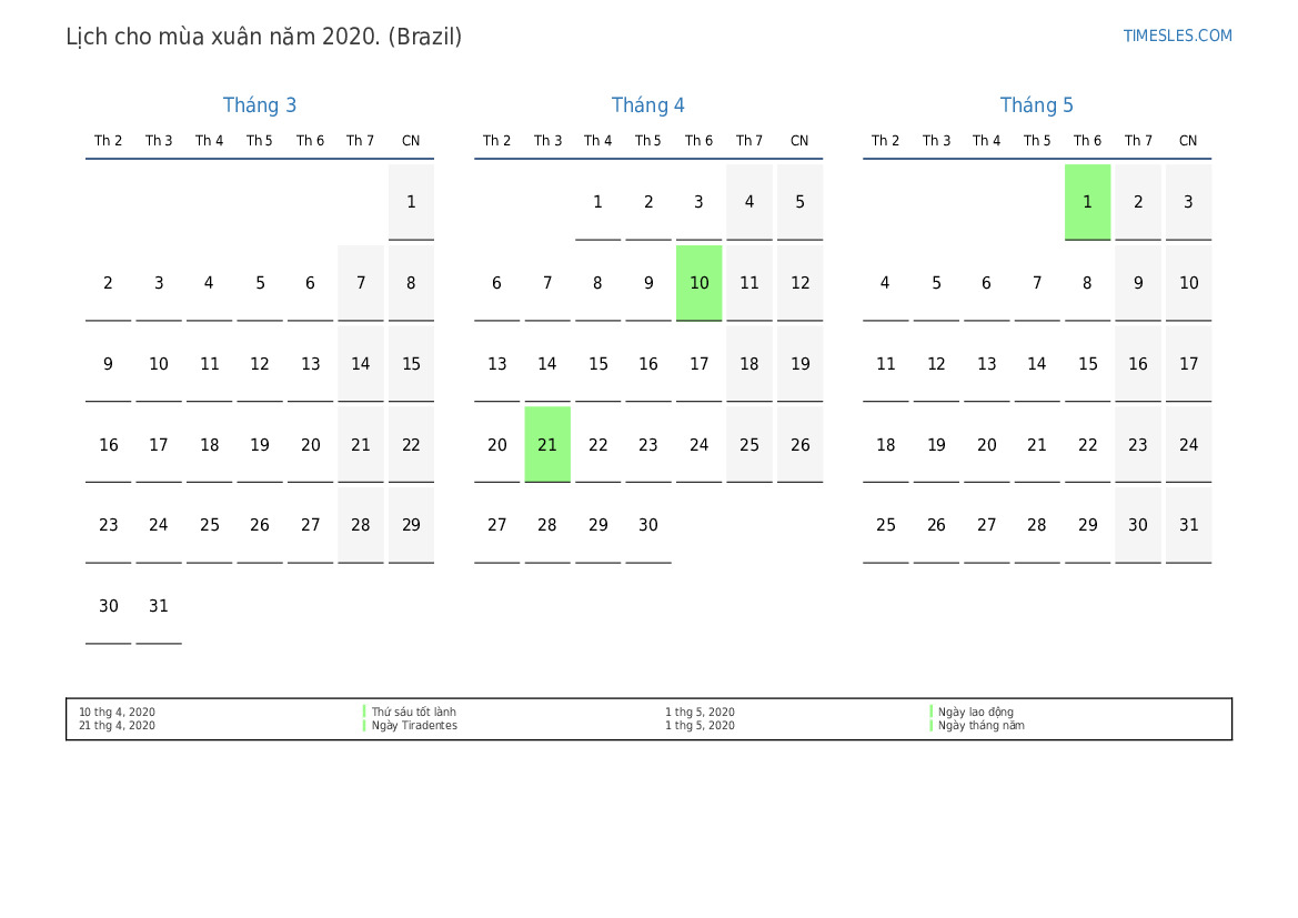 Tải xuống và in lịch PDF với các ngày lễ và cuối tuần cho mùa xuân năm 2020 cho Brazil