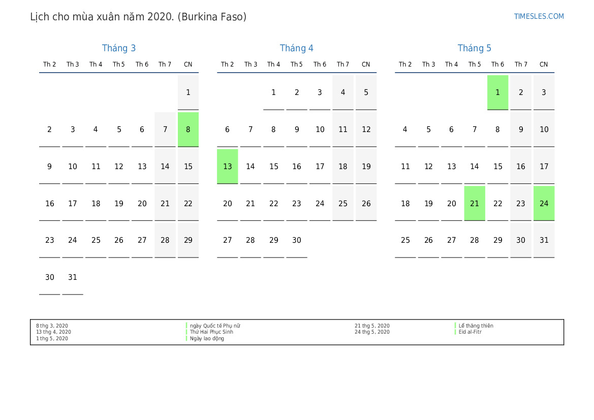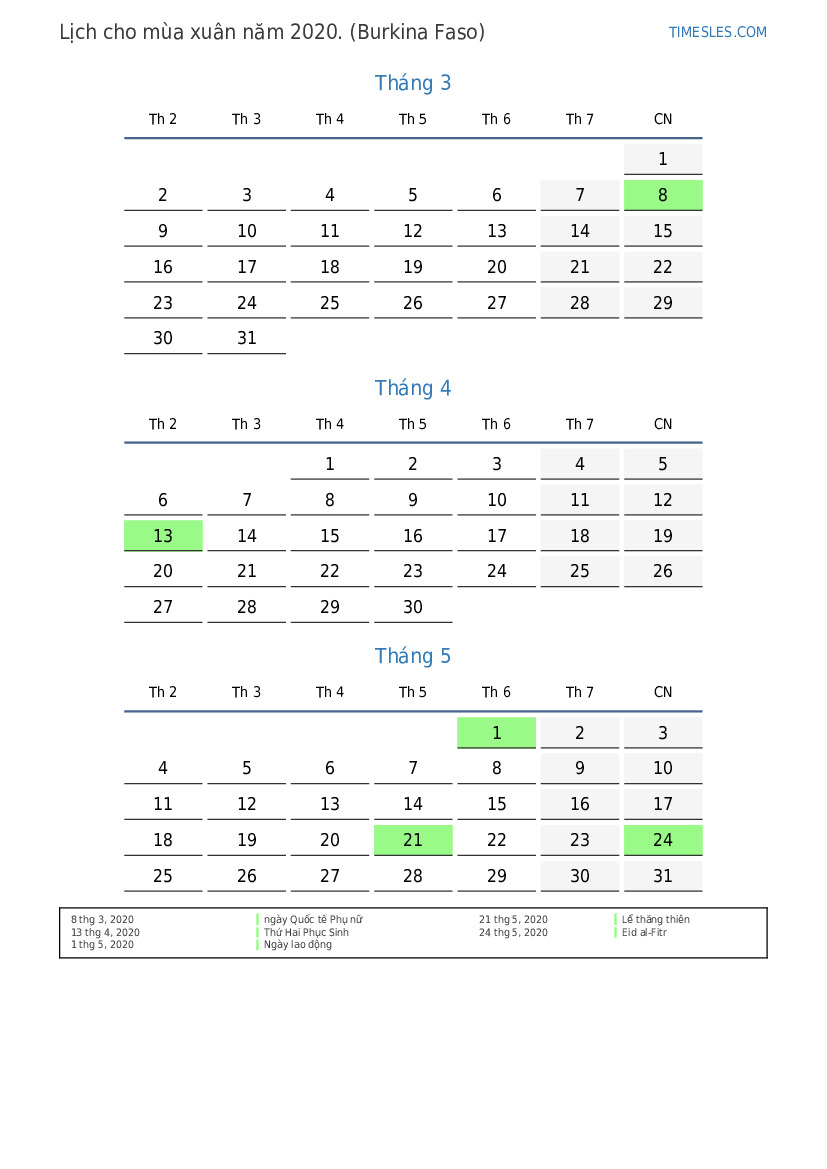Tải xuống và in lịch PDF với các ngày lễ và cuối tuần cho mùa xuân năm 2020 cho Burkina Faso