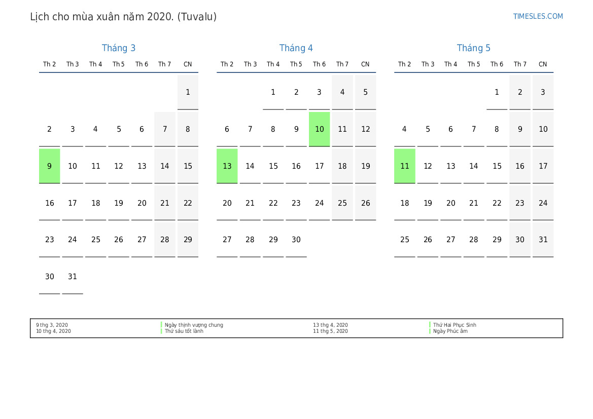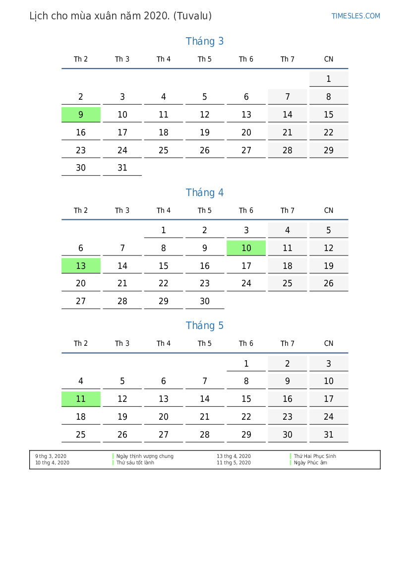 Lịch cho mùa xuân năm 2020 cho Tuvalu