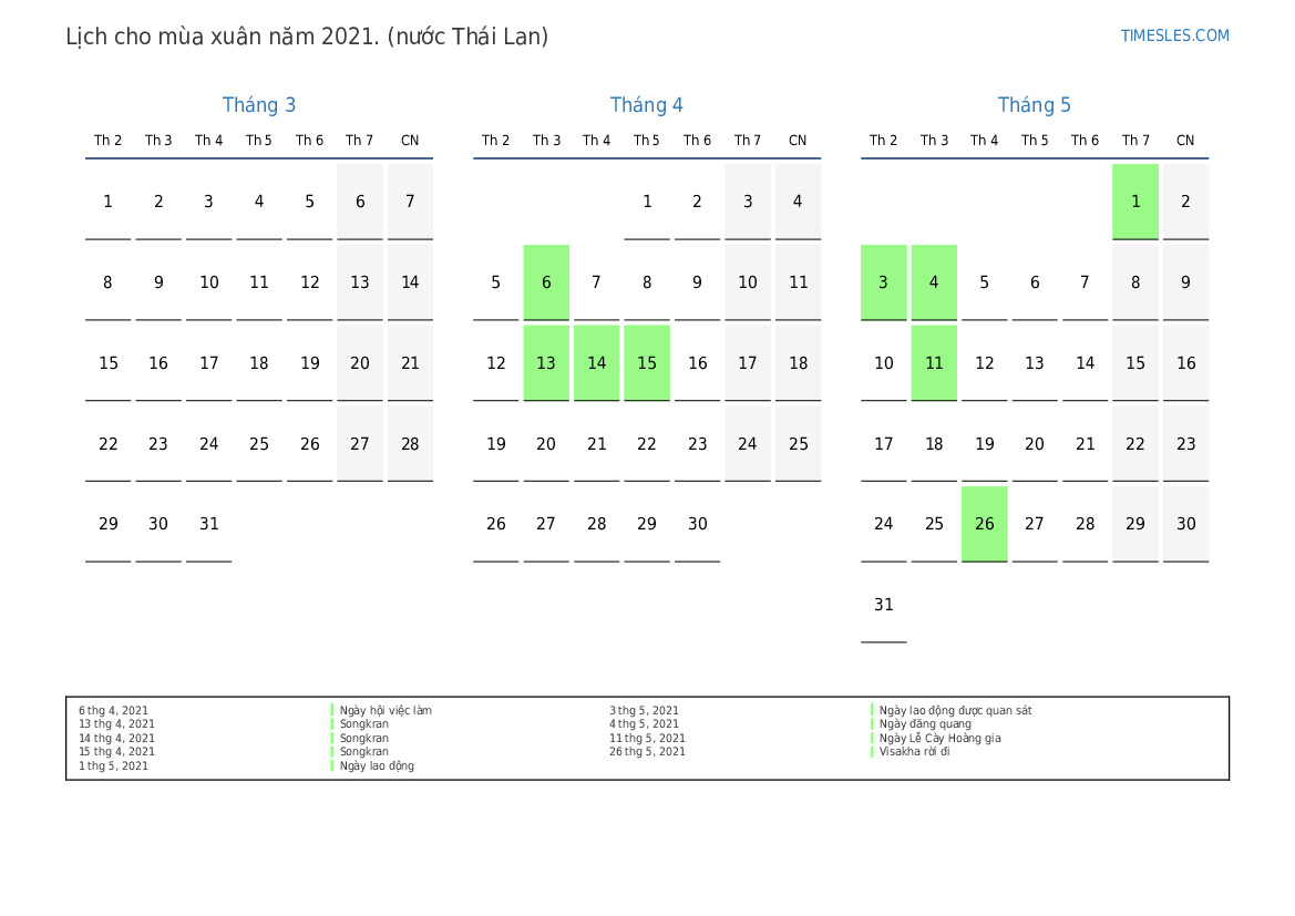 Lịch cho mùa xuân năm 2021 cho Thái Lan