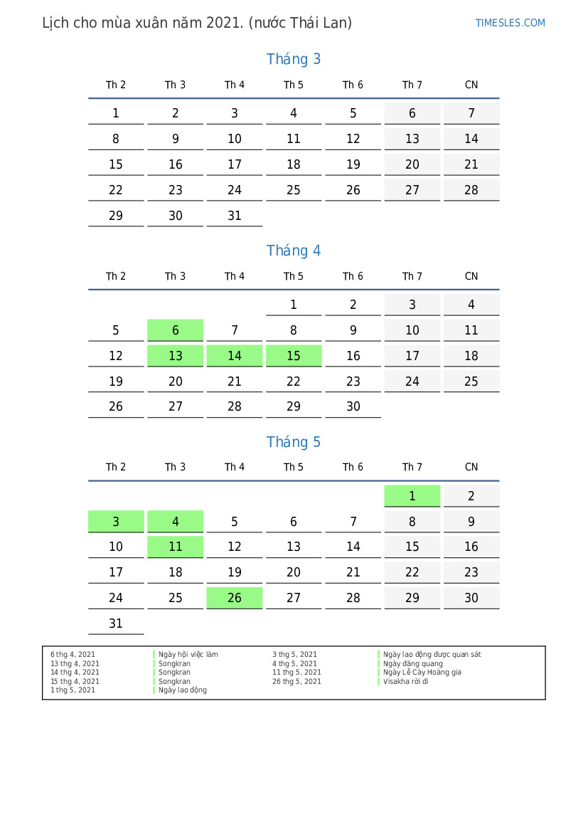 Vào mùa xuân năm 2021, có 10 ngày nghỉ và ngày nghỉ ở Thái Lan. Mùa xuân năm 2021 bắt đầu vào thứ hai và kết thúc vào thứ hai.