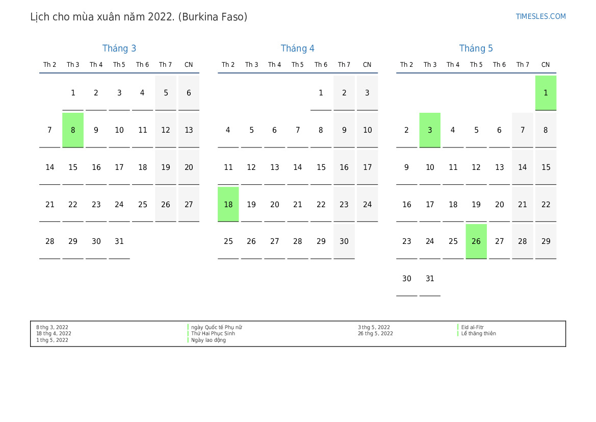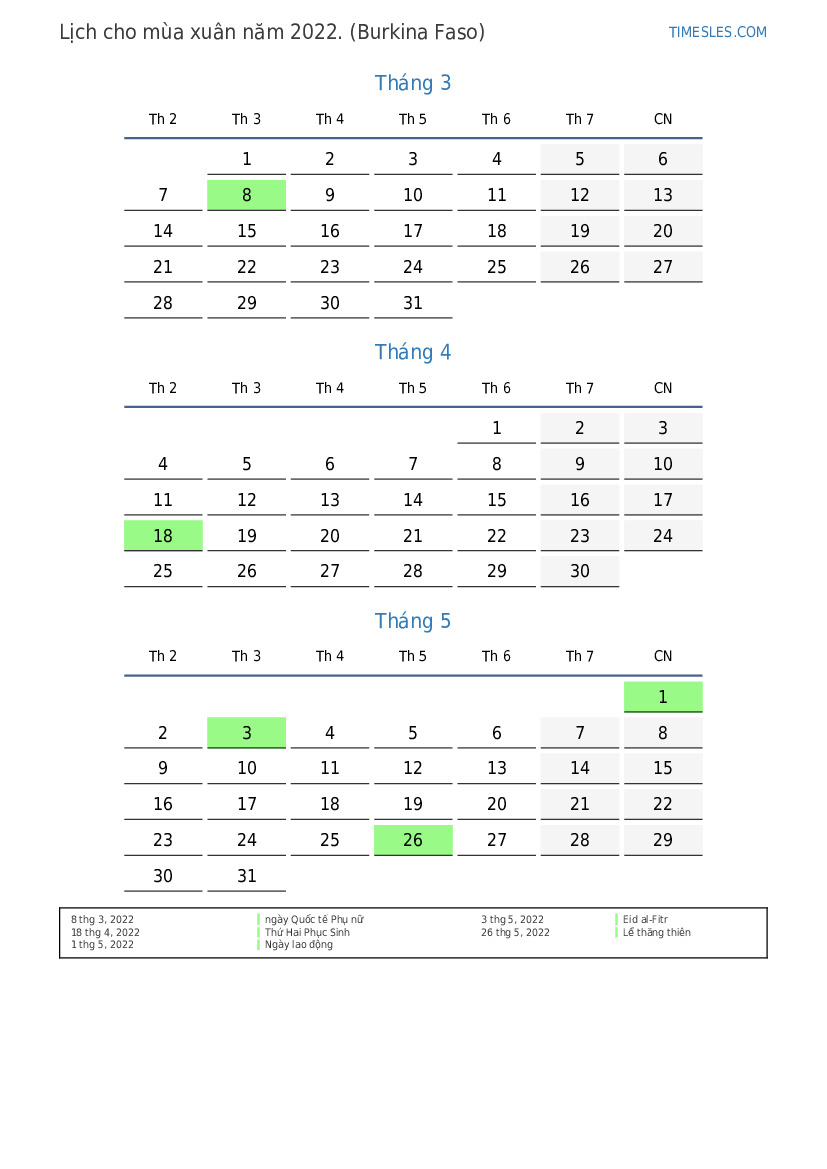Tải xuống và in lịch PDF với các ngày lễ và cuối tuần cho mùa xuân năm 2022 cho Burkina Faso