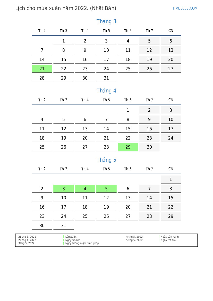 Tải xuống và in lịch PDF với các ngày lễ và cuối tuần cho mùa xuân năm 2022 cho Nhật Bản