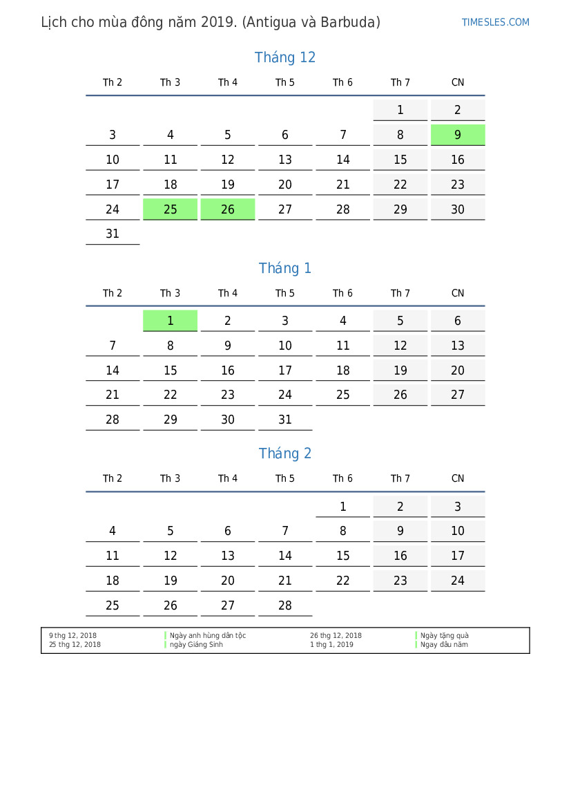 Lịch cho mùa hè năm 2019 cho Antigua và Barbuda