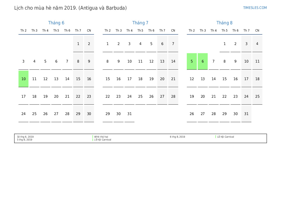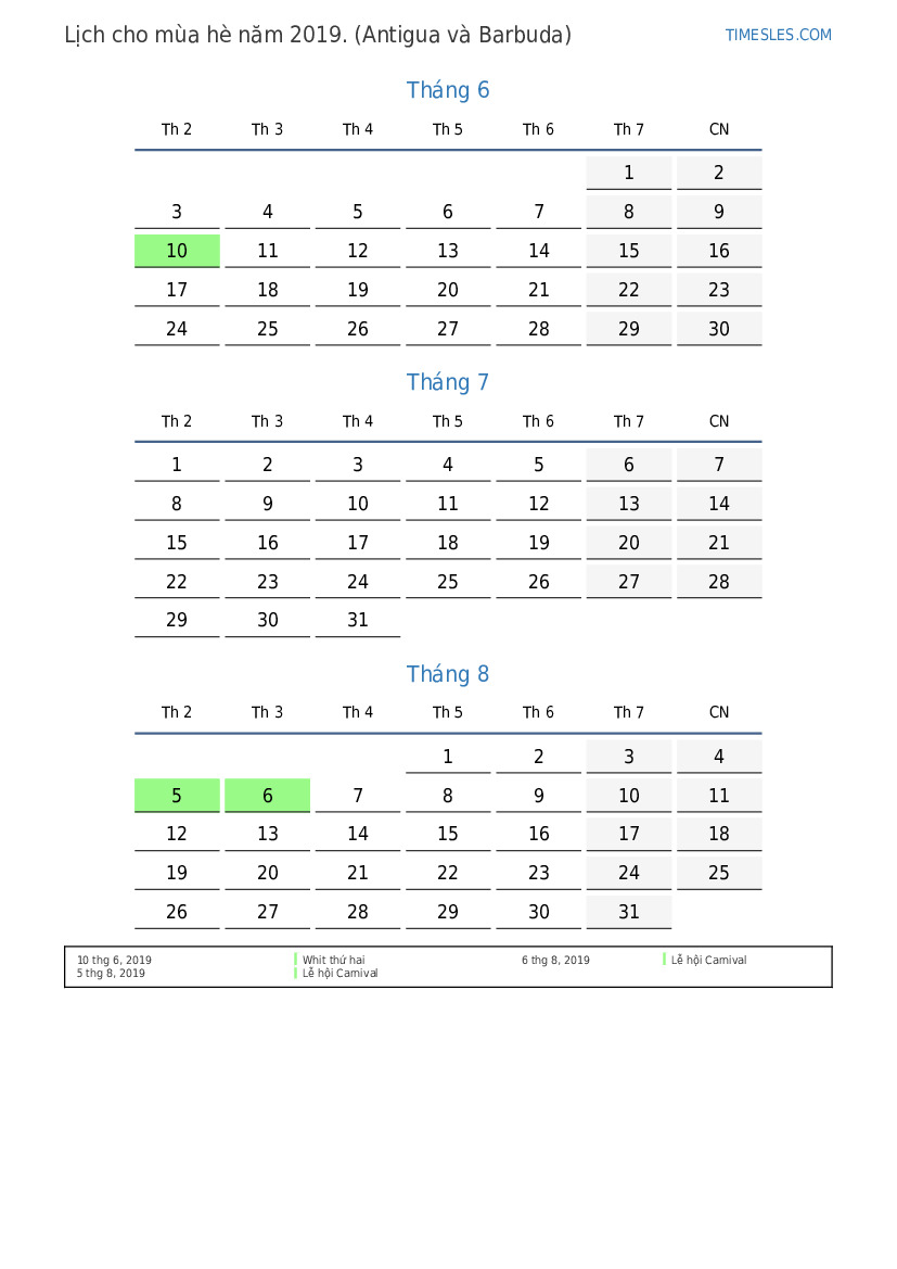 Tải xuống và in lịch PDF với các ngày lễ và cuối tuần cho mùa hè năm 2019 cho Antigua và Barbuda