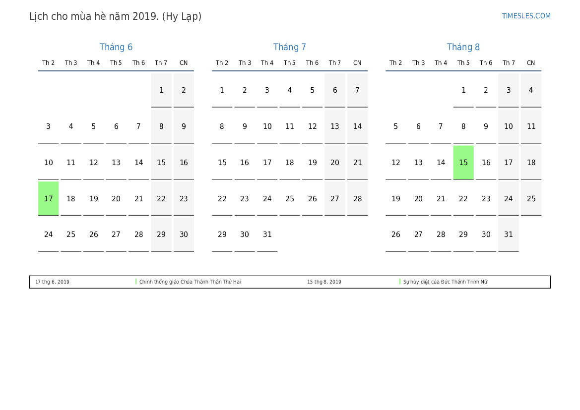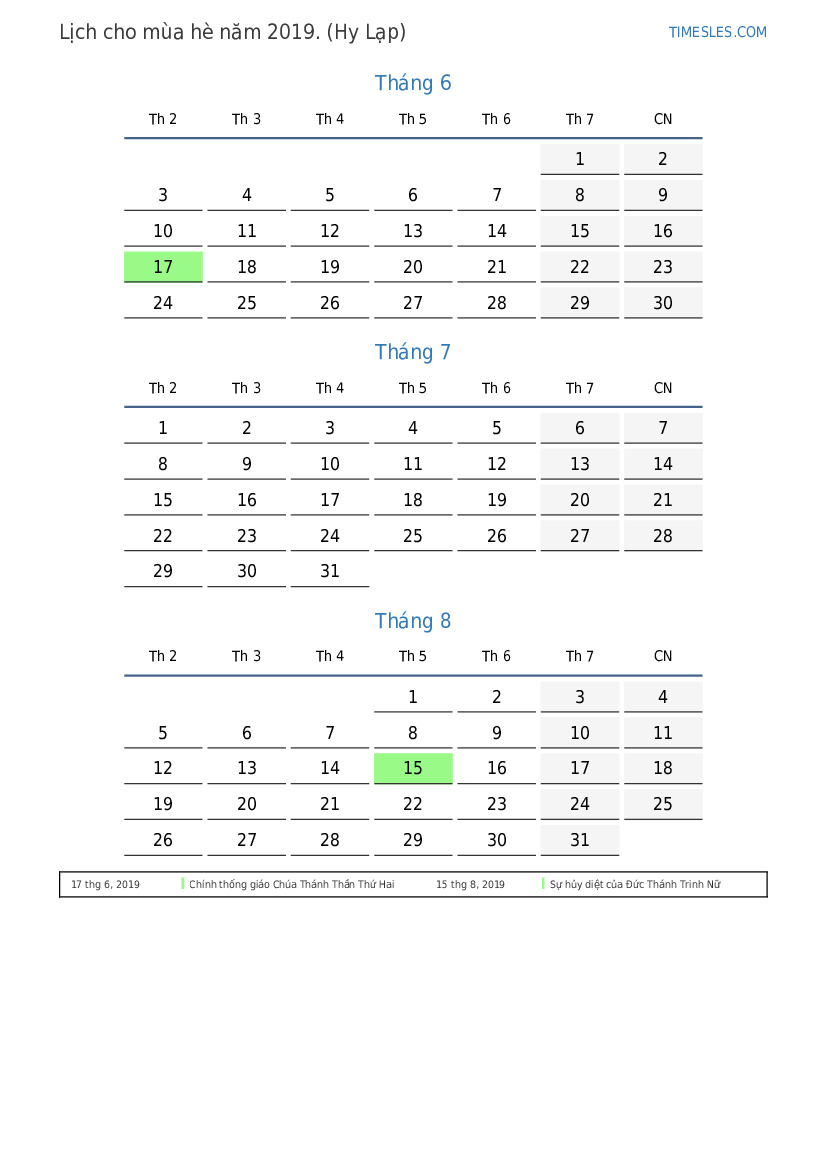 Tải xuống và in lịch PDF với các ngày lễ và cuối tuần cho mùa hè năm 2019 cho Hy Lạp