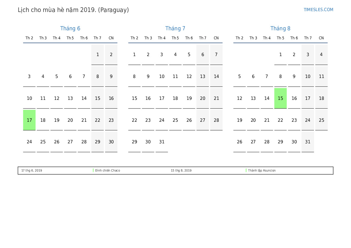 Tải xuống và in lịch PDF với các ngày lễ và cuối tuần cho mùa hè năm 2019 cho Paraguay