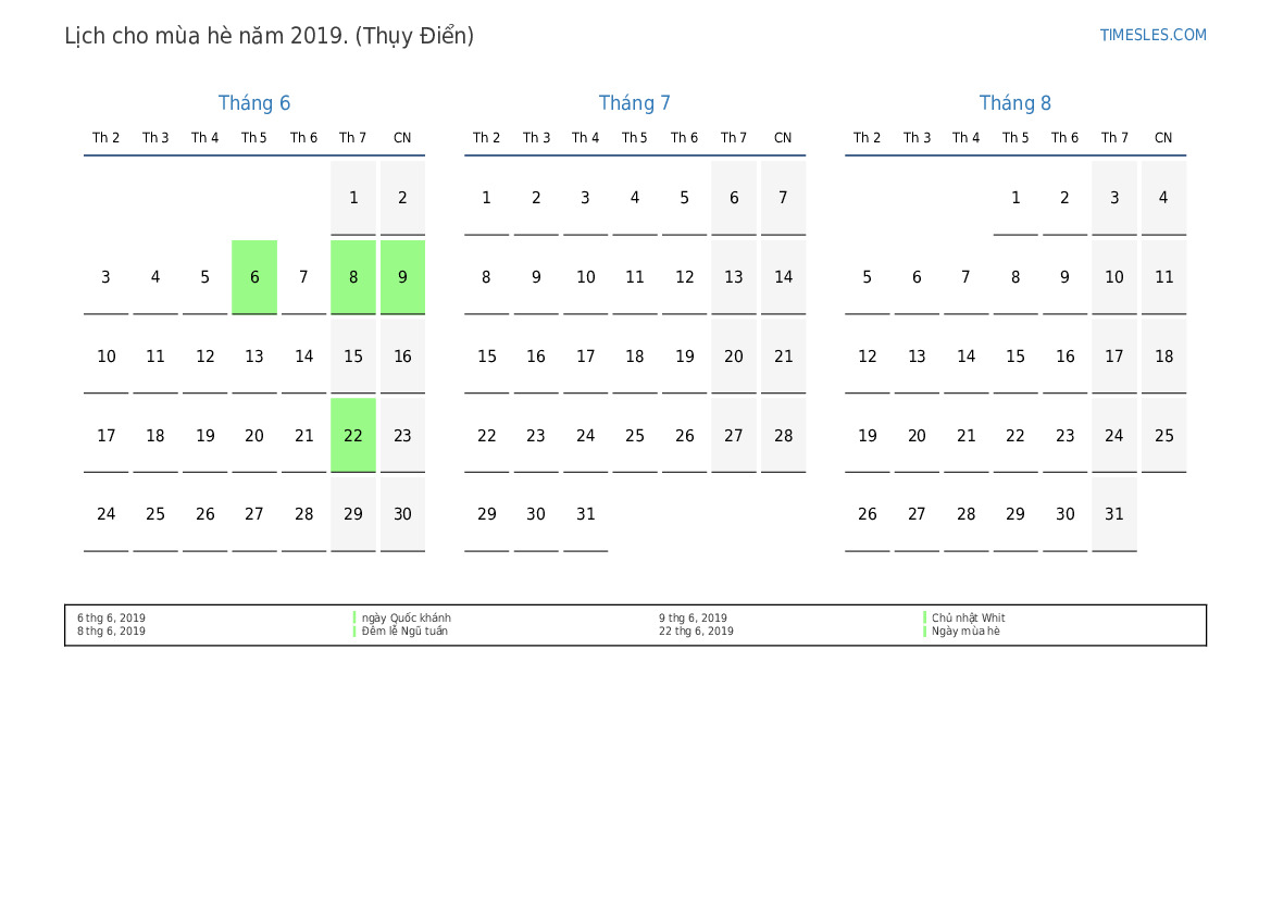 Tải xuống và in lịch PDF với các ngày lễ và cuối tuần cho mùa hè năm 2019 cho Thụy Điển
