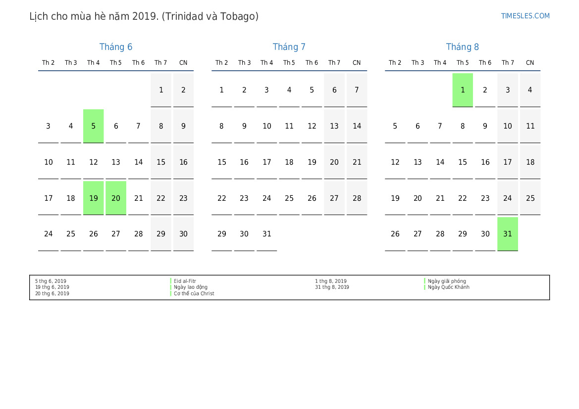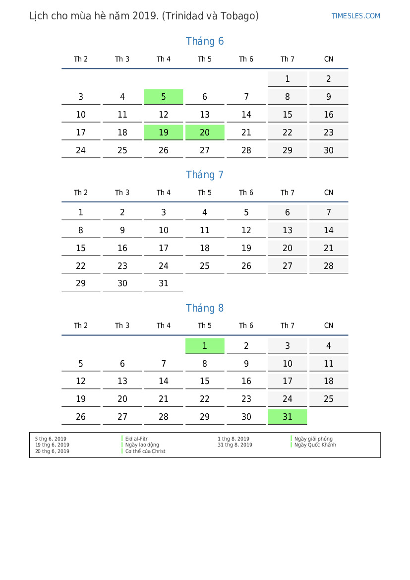 Tải xuống và in lịch PDF với các ngày lễ và cuối tuần cho mùa hè năm 2019 cho Trinidad và Tobago