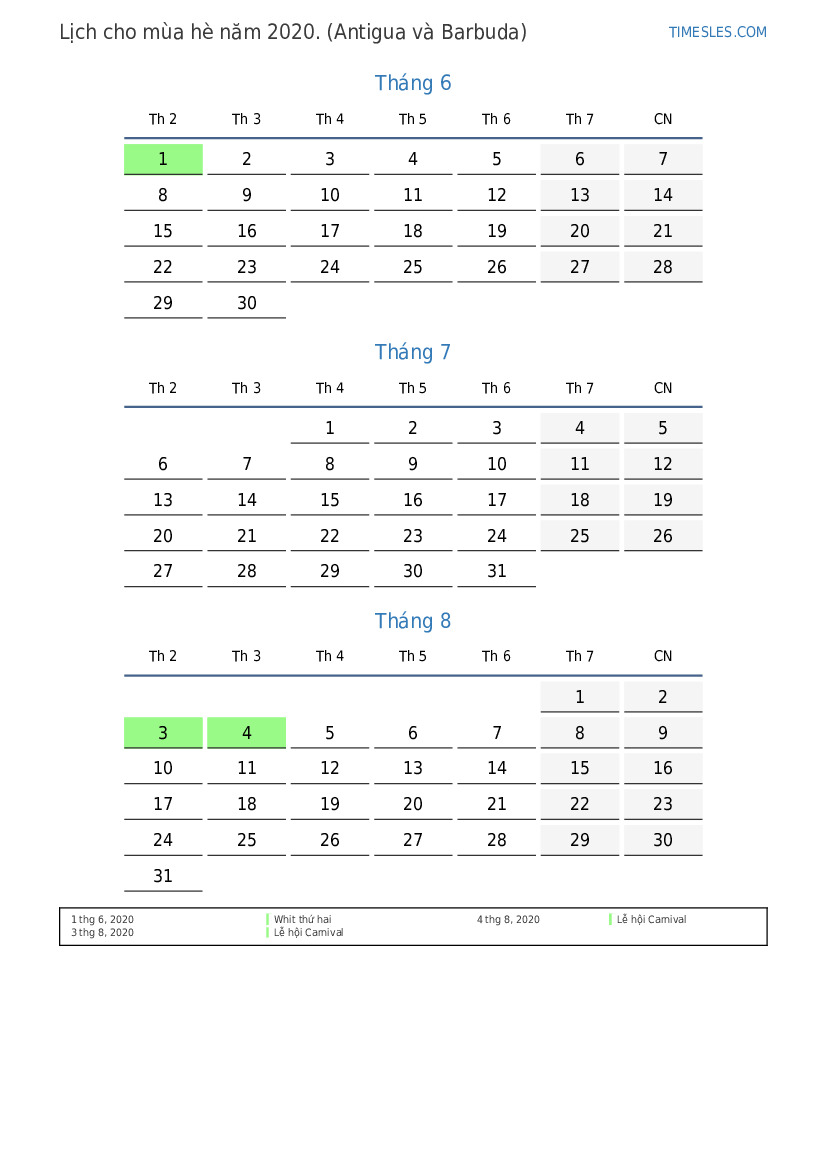 Tải xuống và in lịch PDF với các ngày lễ và cuối tuần cho mùa hè năm 2020 cho Antigua và Barbuda