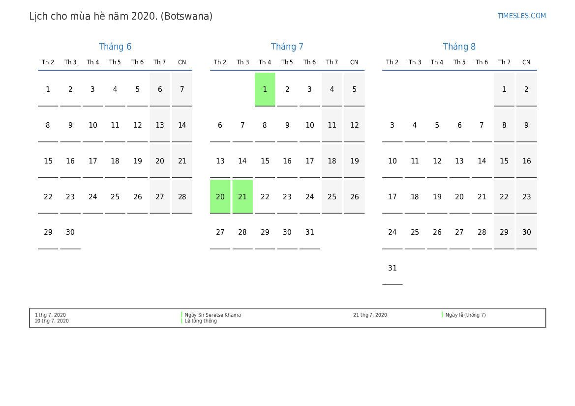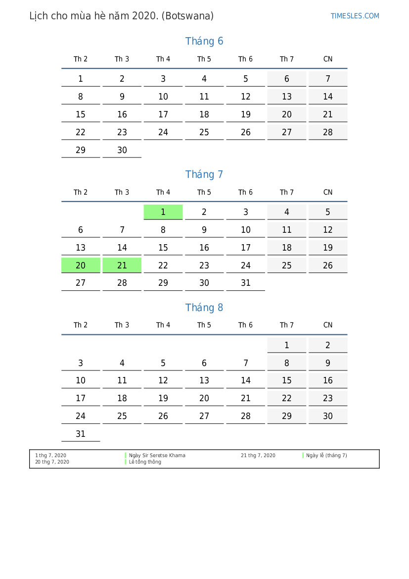 Tải xuống và in lịch PDF với các ngày lễ và cuối tuần cho mùa hè năm 2020 cho Botswana