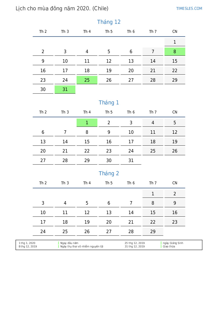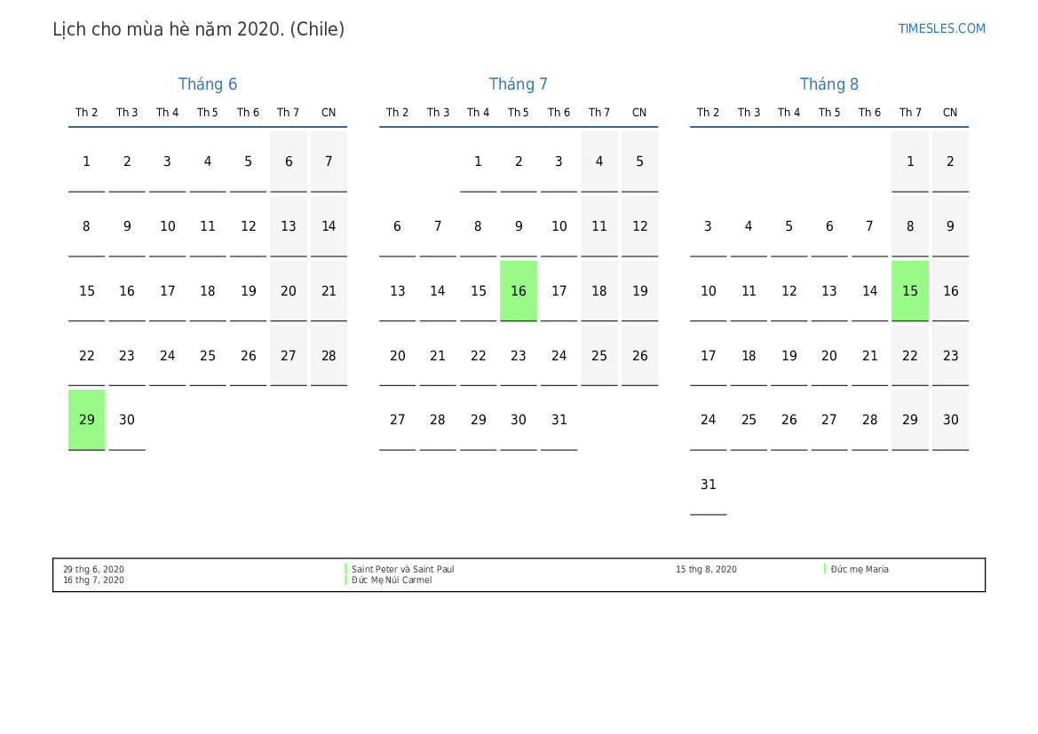 Tải xuống và in lịch PDF với các ngày lễ và cuối tuần cho mùa hè năm 2020 cho Chile