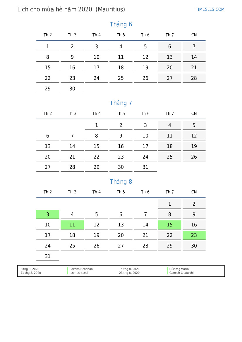 Tải xuống và in lịch PDF với các ngày lễ và cuối tuần cho mùa hè năm 2020 cho Mauritius