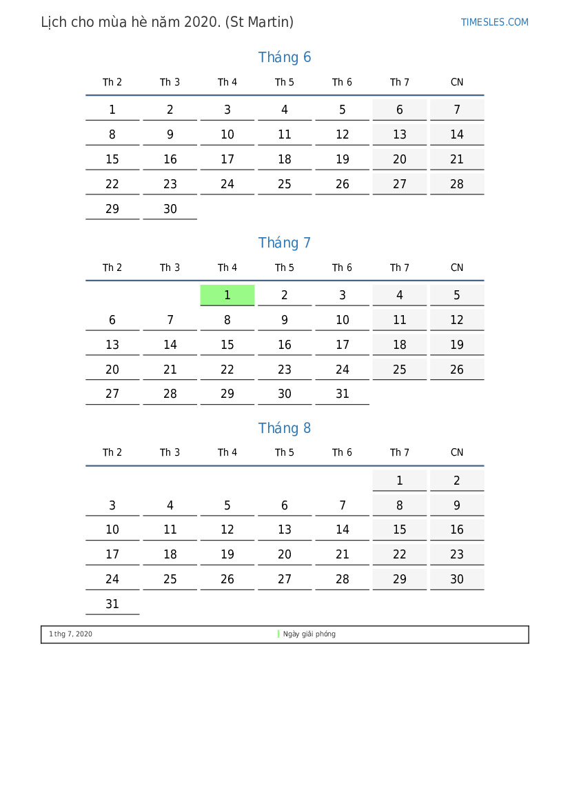 Tải xuống và in lịch PDF với các ngày lễ và cuối tuần cho mùa hè năm 2020 cho Sint Maarten