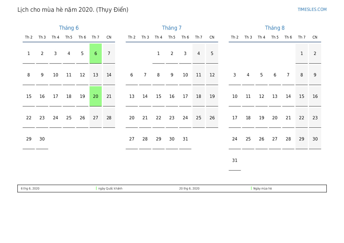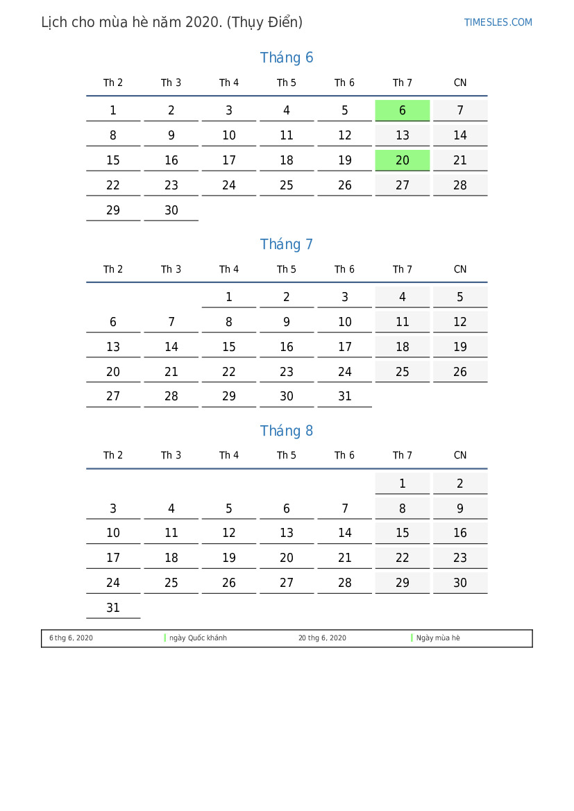 Tải xuống và in lịch PDF với các ngày lễ và cuối tuần cho mùa hè năm 2020 cho Thụy Điển