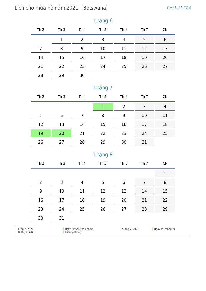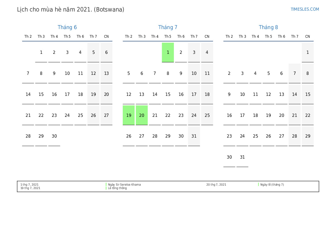 Tải xuống và in lịch PDF với các ngày lễ và cuối tuần cho mùa hè năm 2021 cho Botswana