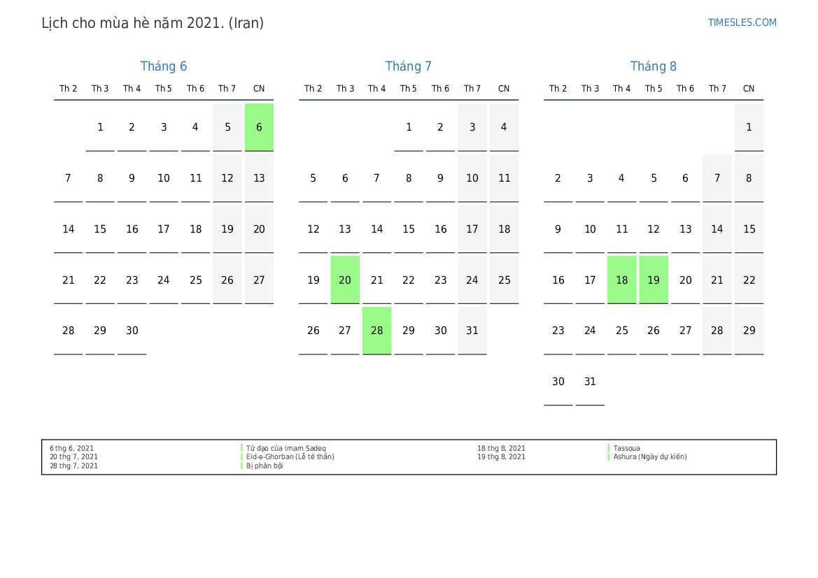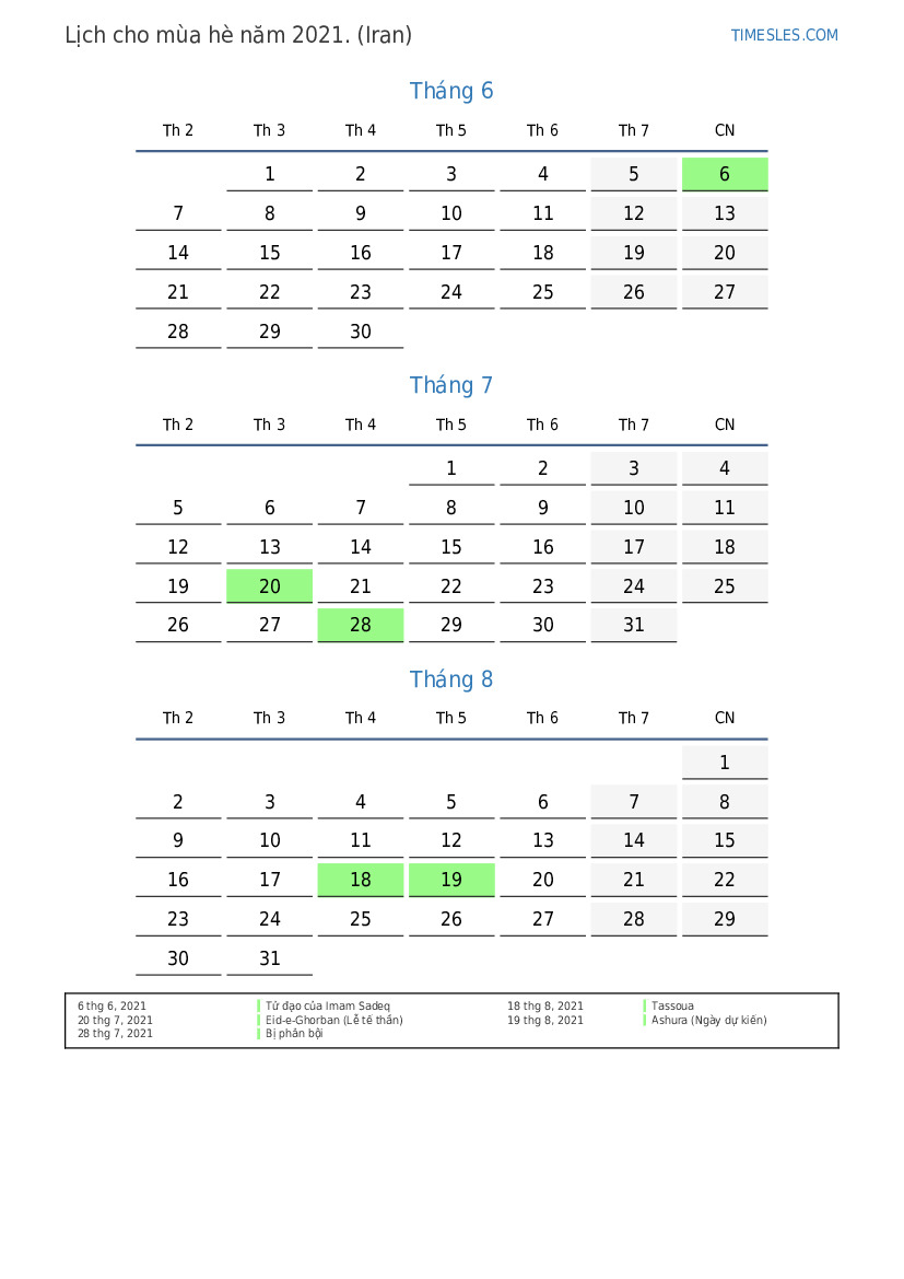 Tải xuống và in lịch PDF với các ngày lễ và cuối tuần cho mùa hè năm 2021 cho Iran