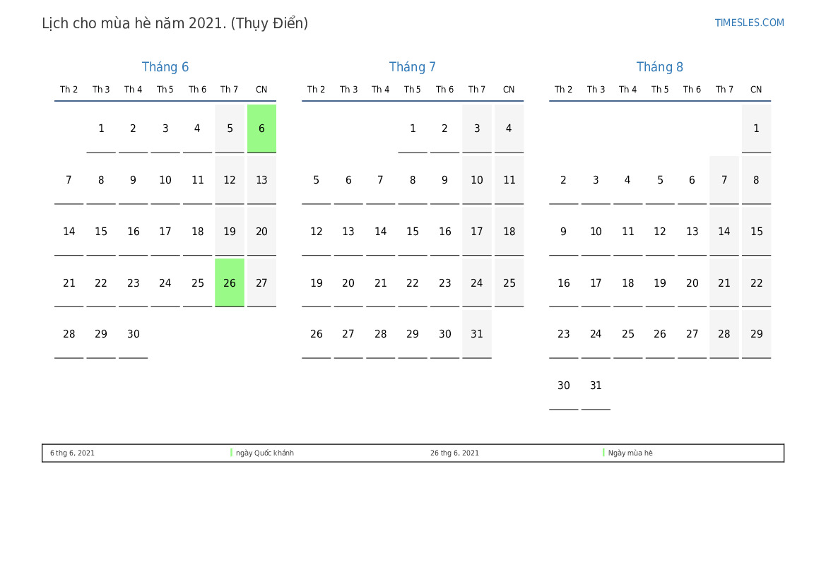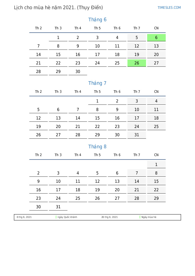 Tải xuống và in lịch PDF với các ngày lễ và cuối tuần cho mùa hè năm 2021 cho Thụy Điển