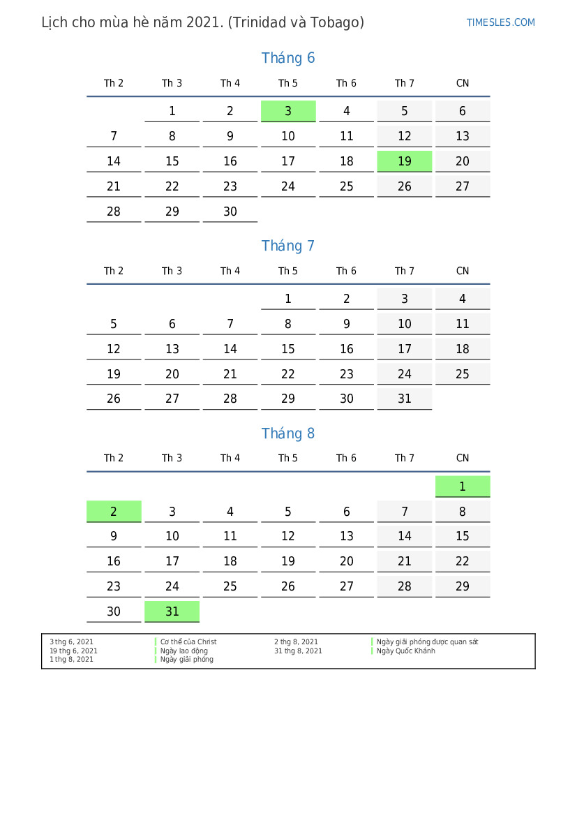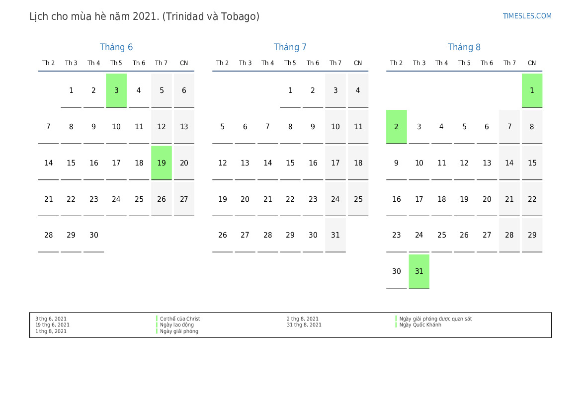 Tải xuống và in lịch PDF với các ngày lễ và cuối tuần cho mùa hè năm 2021 cho Trinidad và Tobago