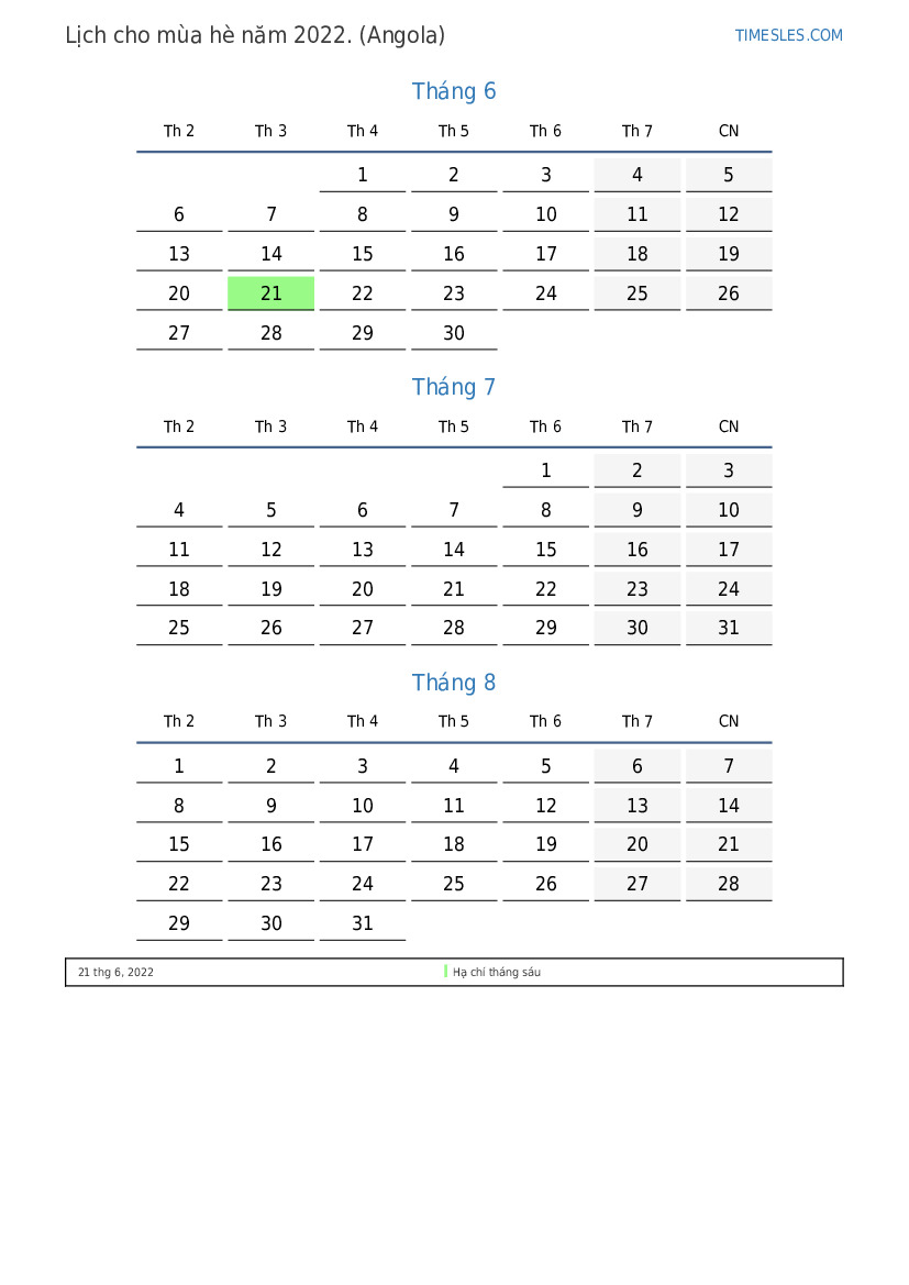 Tải xuống và in lịch PDF với các ngày lễ và cuối tuần cho mùa hè năm 2022 cho Angola