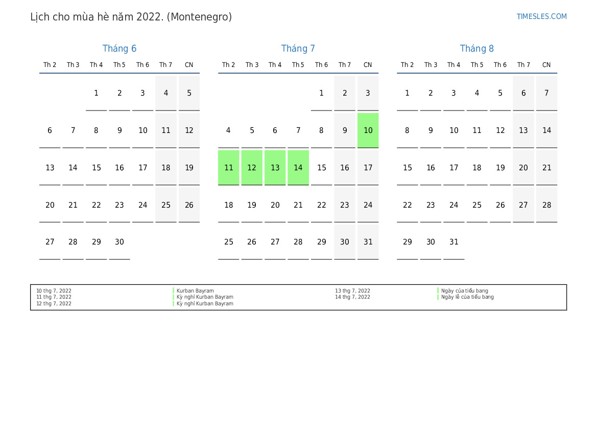 Tải xuống và in lịch PDF với các ngày lễ và cuối tuần cho mùa hè năm 2022 cho Montenegro