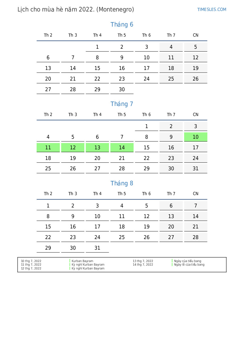 Vào mùa hè năm 2022, có 6 ngày nghỉ và ngày nghỉ ở Montenegro. Mùa hè năm 2022 bắt đầu vào thứ Tư và kết thúc vào thứ Tư.