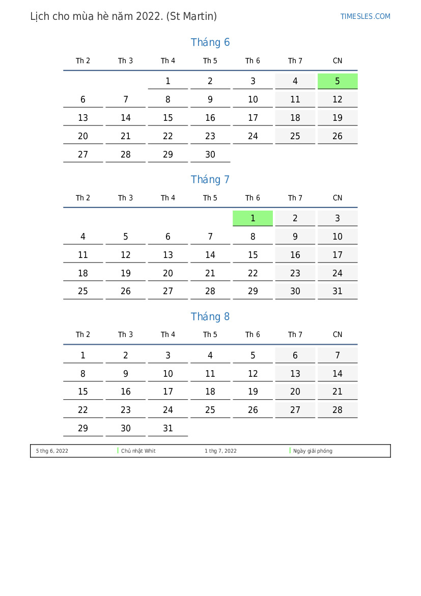Tải xuống và in lịch PDF với các ngày lễ và cuối tuần cho mùa hè năm 2022 cho Sint Maarten