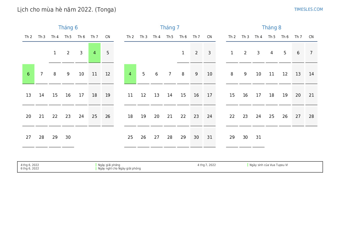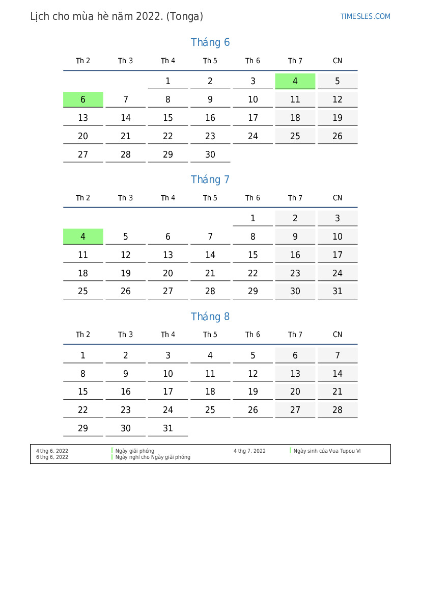 Lịch nghỉ lễ và cuối tuần cho mùa hè năm 2022 cho Tonga