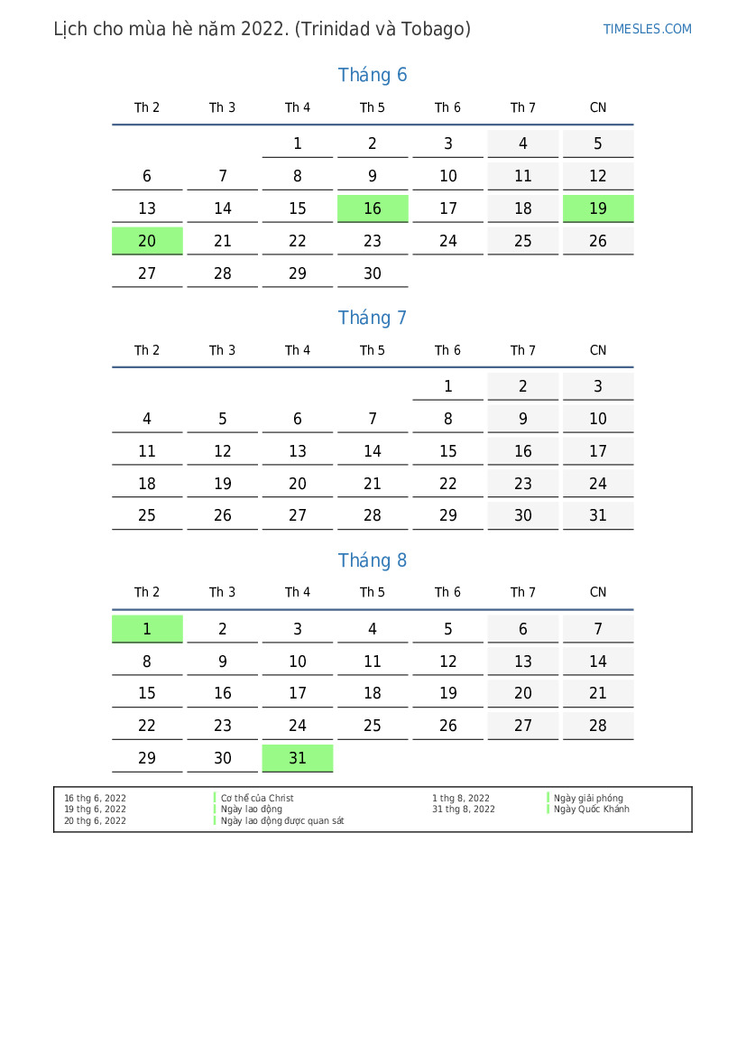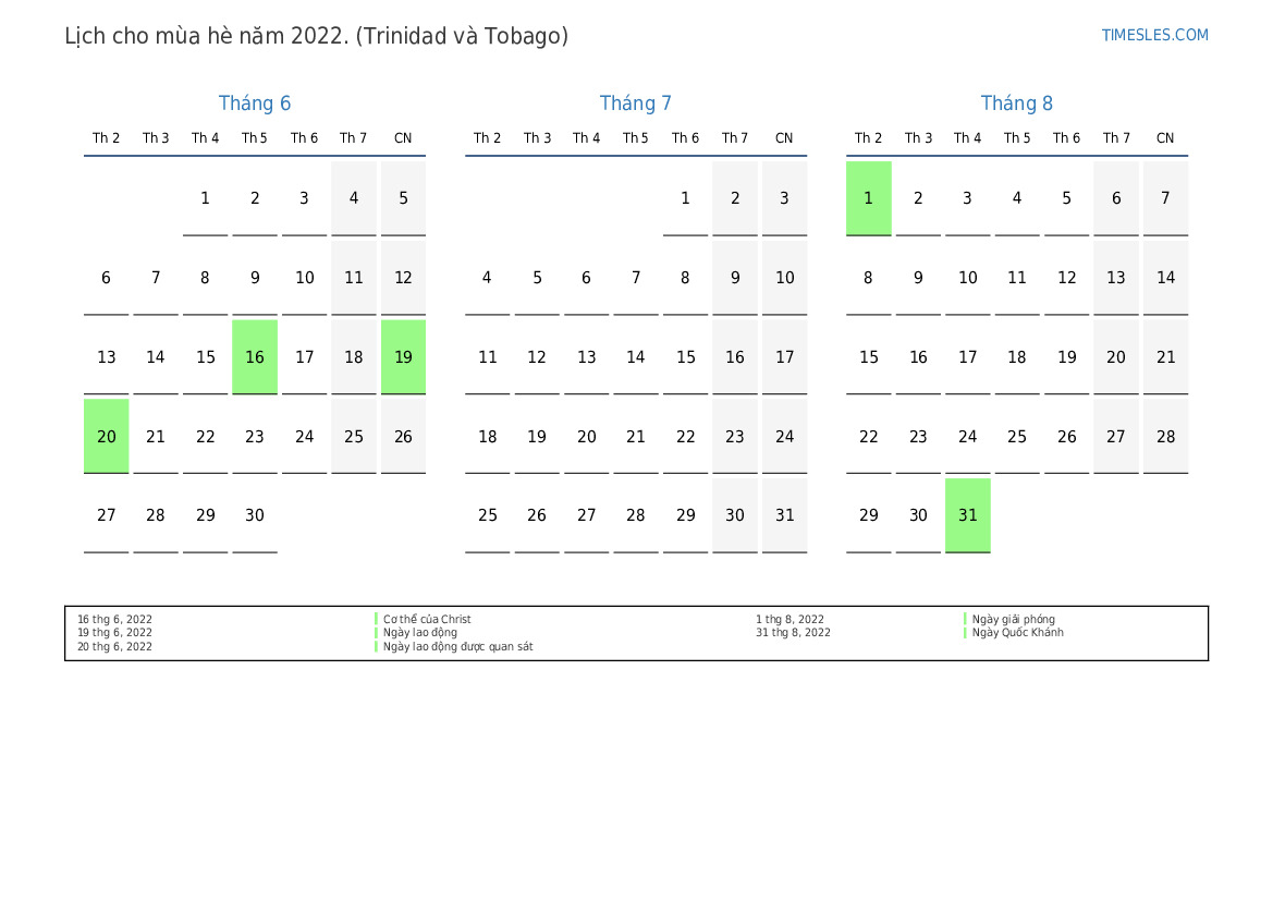 Tải xuống và in lịch PDF với các ngày lễ và cuối tuần cho mùa hè năm 2022 cho Trinidad và Tobago