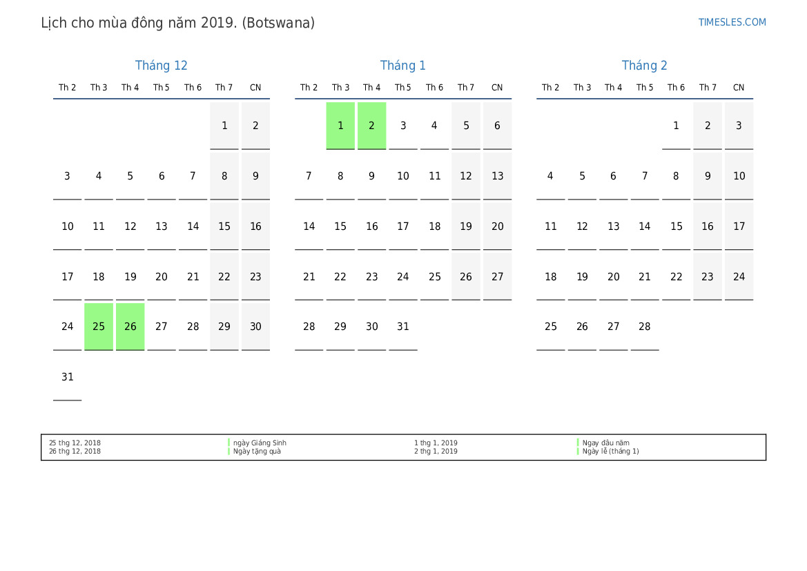 Tải xuống và in lịch PDF với các ngày lễ và cuối tuần cho mùa đông năm 2019 cho Botswana