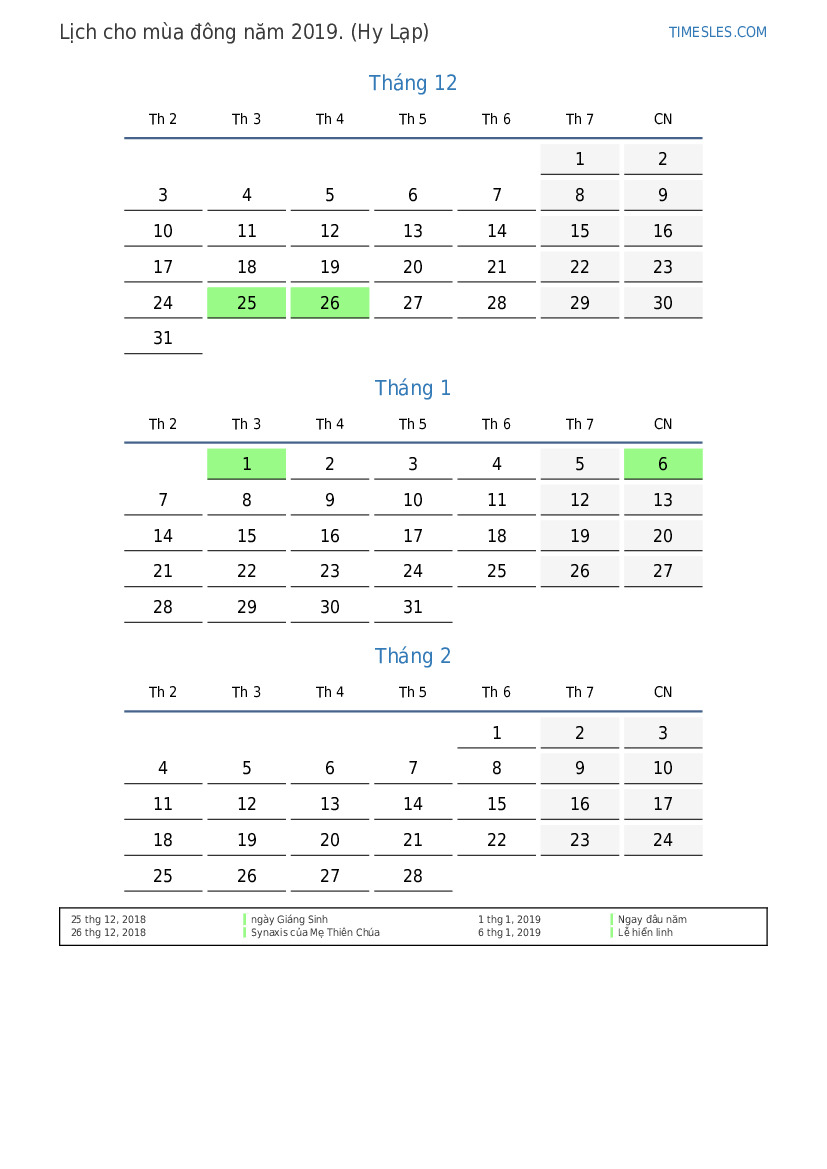 Tải xuống và in lịch PDF với các ngày lễ và cuối tuần cho mùa đông năm 2019 cho Hy Lạp
