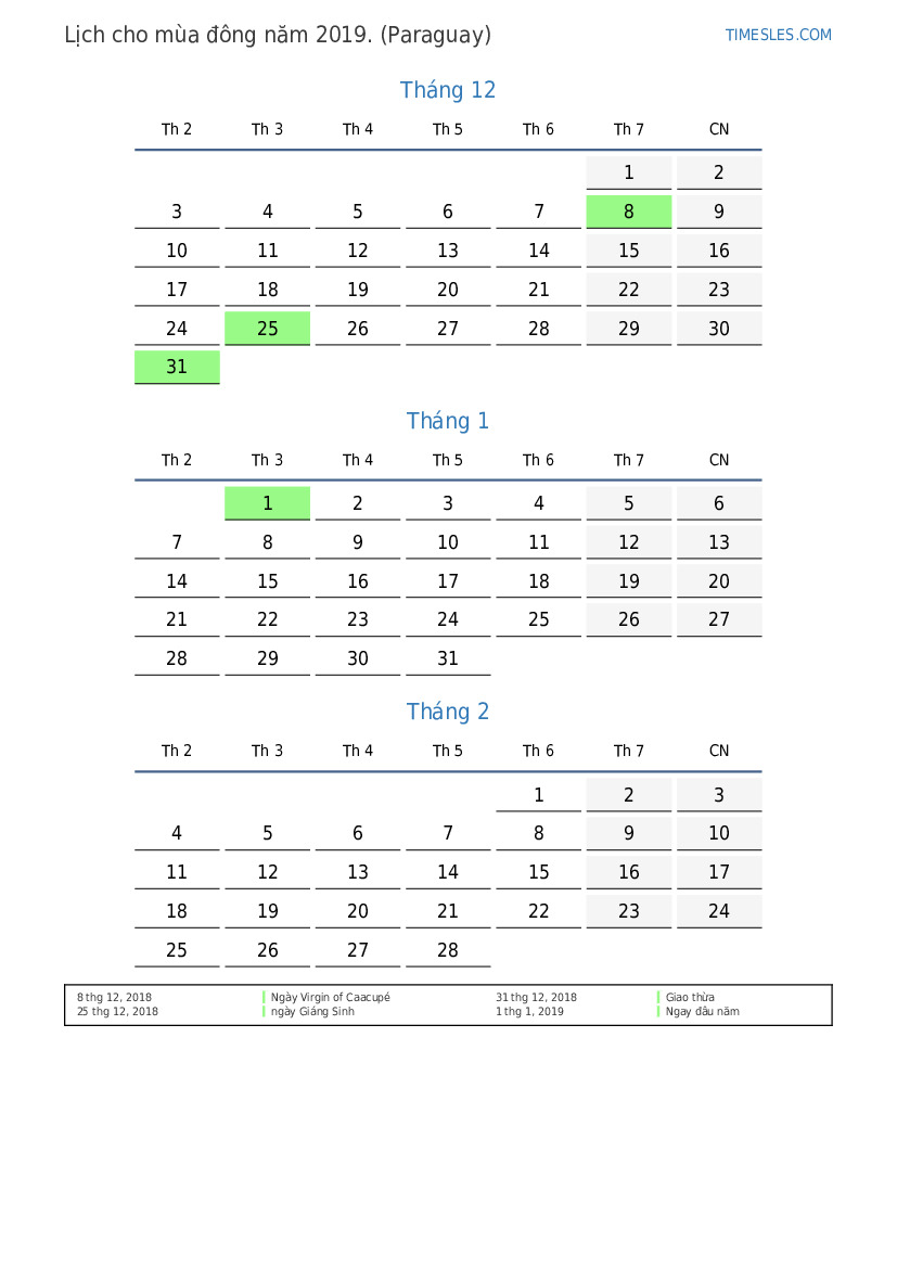 Tải xuống và in lịch PDF với các ngày lễ và cuối tuần cho mùa đông năm 2019 cho Paraguay