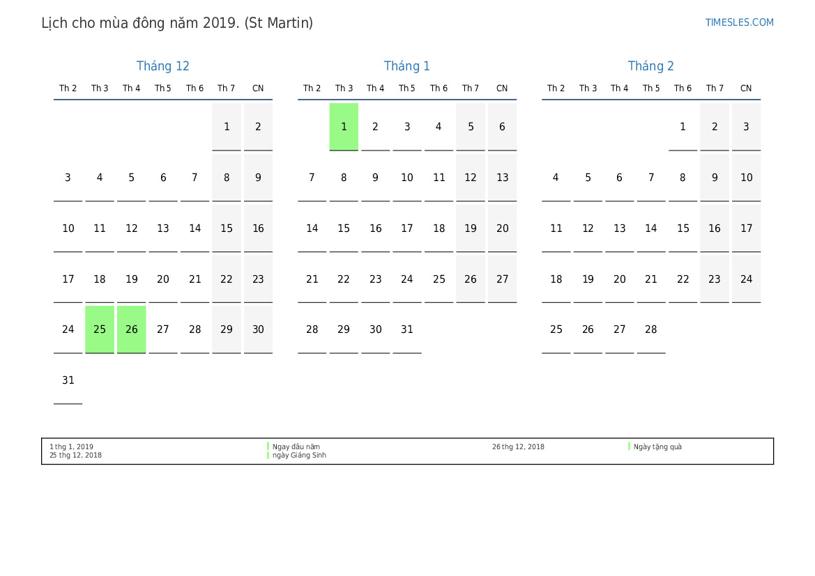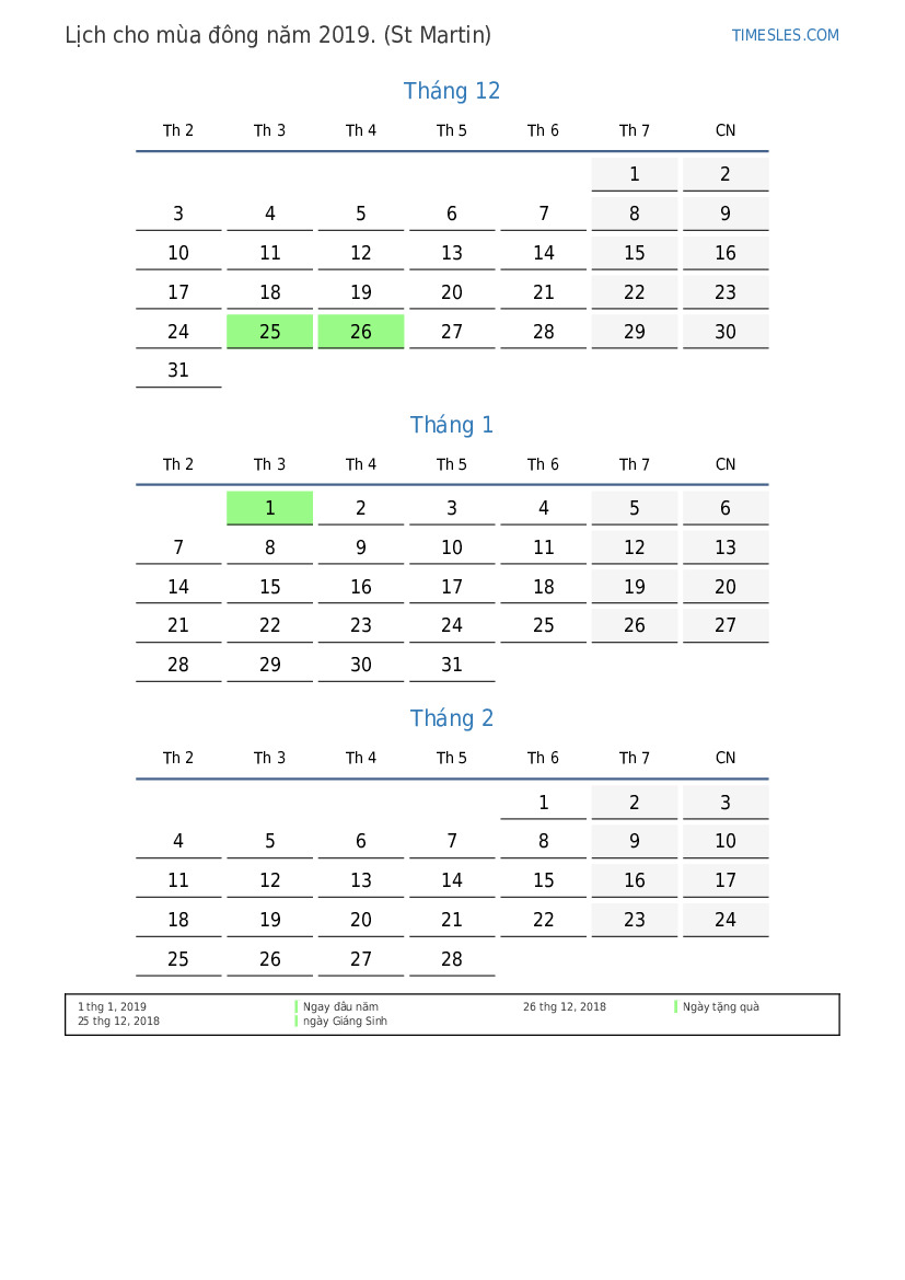 Tải xuống và in lịch PDF với các ngày lễ và cuối tuần cho mùa đông năm 2019 cho Sint Maarten