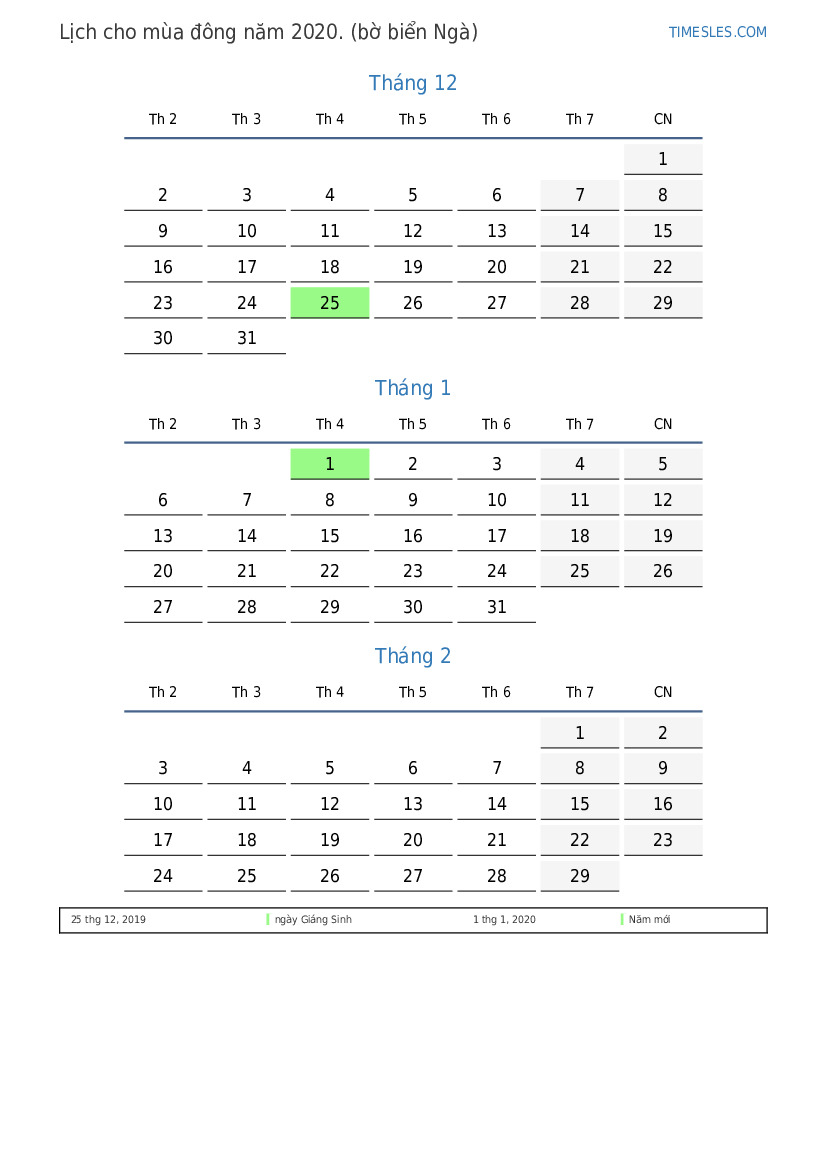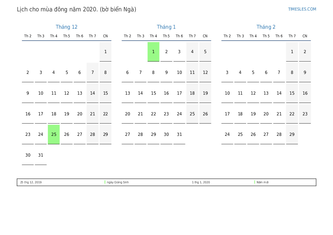Tải xuống và in lịch PDF với các ngày lễ và cuối tuần cho mùa đông năm 2020 cho Cote d'Ivoire