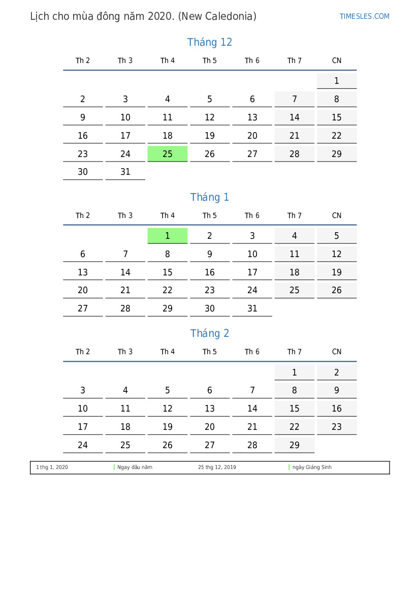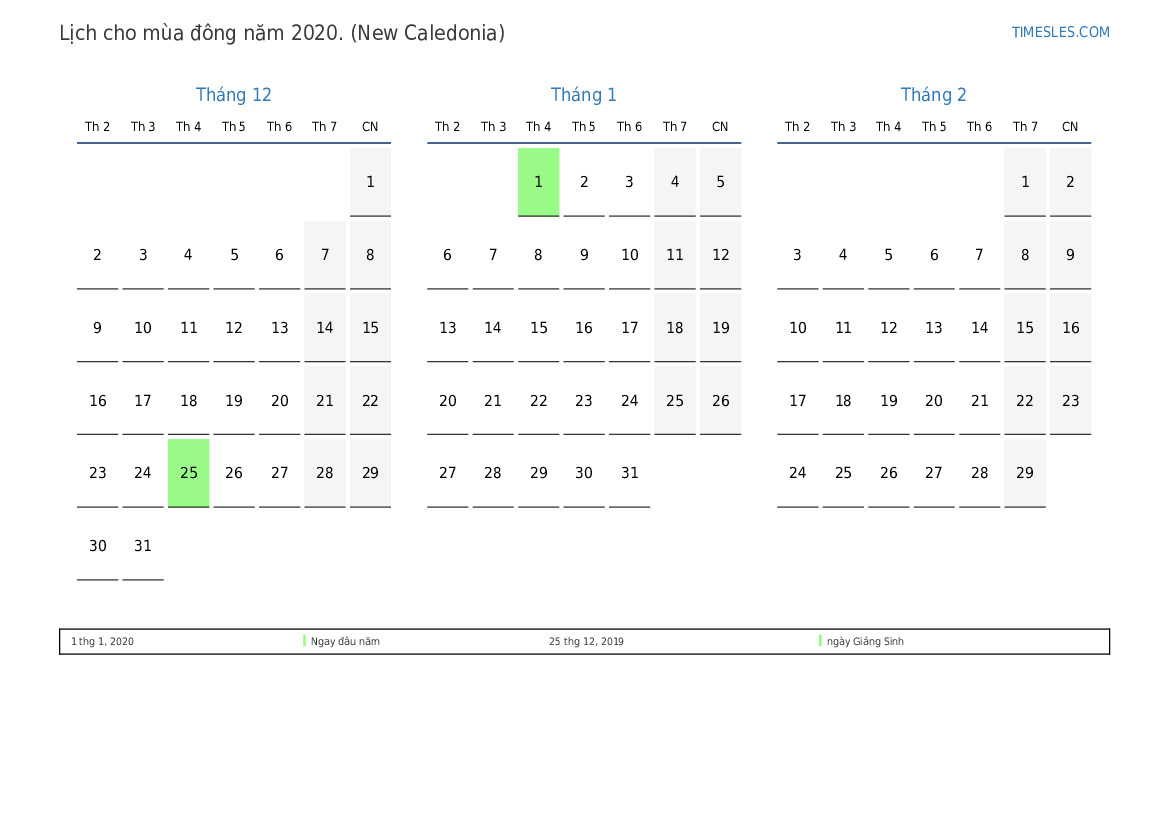 Tải xuống và in lịch PDF với các ngày lễ và cuối tuần cho mùa đông năm 2020 cho New Caledonia