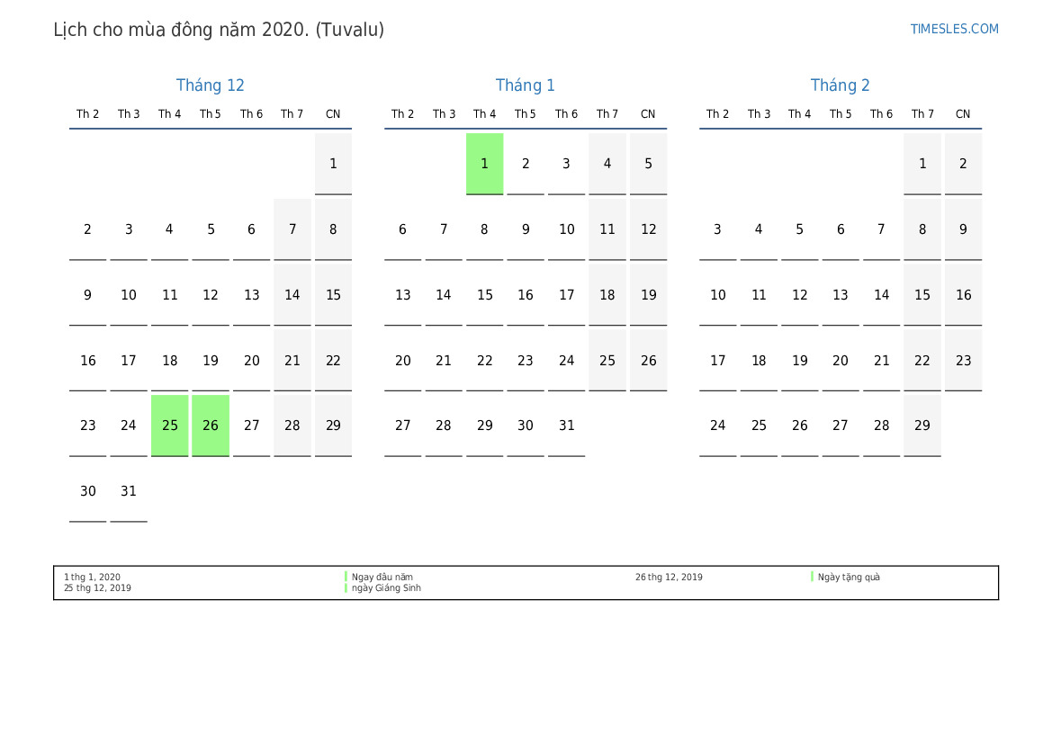 Lịch nghỉ lễ và cuối tuần cho mùa đông năm 2020 cho Tuvalu