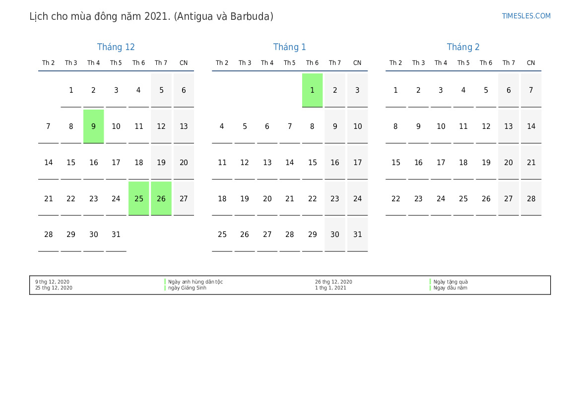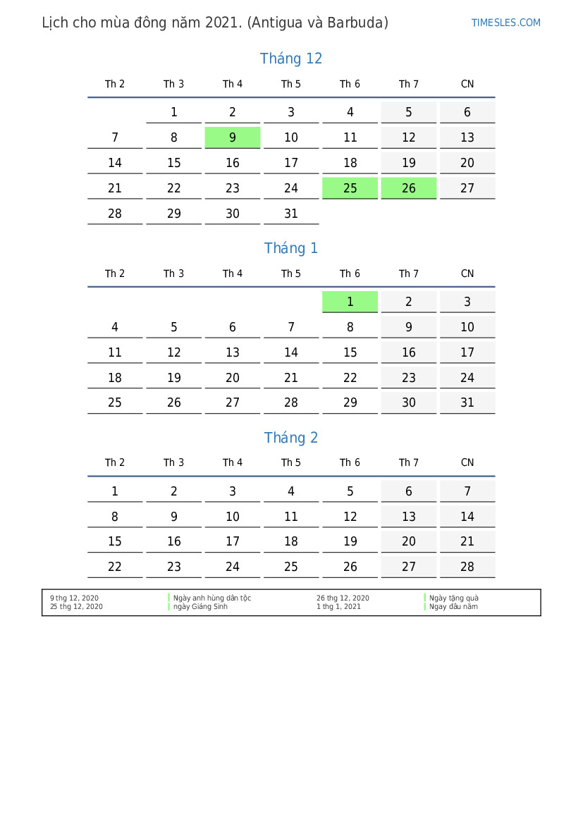 Tải xuống và in lịch PDF với các ngày lễ và cuối tuần cho mùa đông năm 2021 cho Antigua và Barbuda