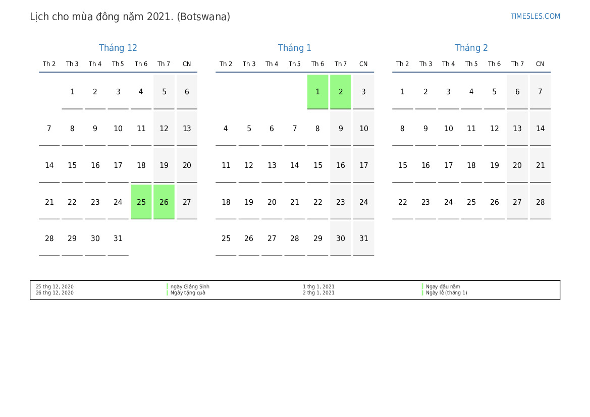 Tải xuống và in lịch PDF với các ngày lễ và cuối tuần cho mùa đông năm 2021 cho Botswana