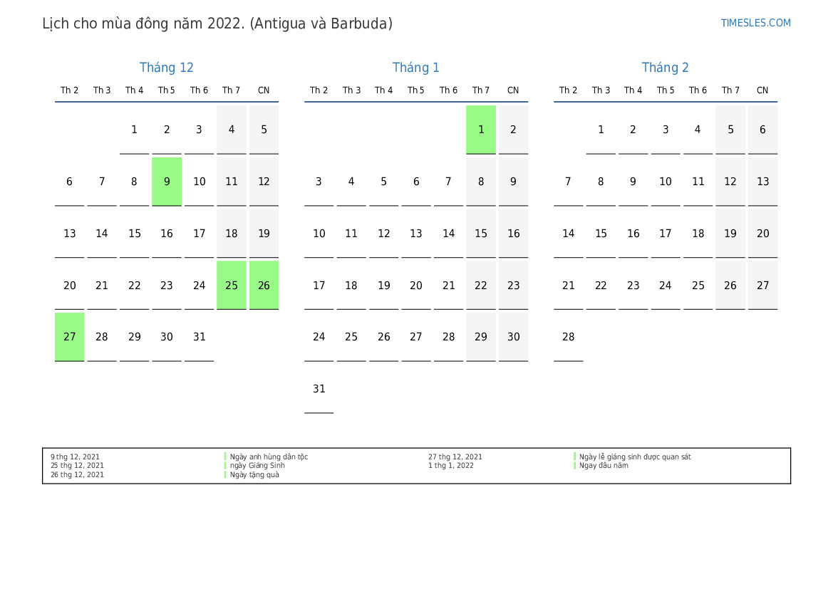 Tải xuống và in lịch PDF với các ngày lễ và cuối tuần cho mùa đông năm 2022 cho Antigua và Barbuda