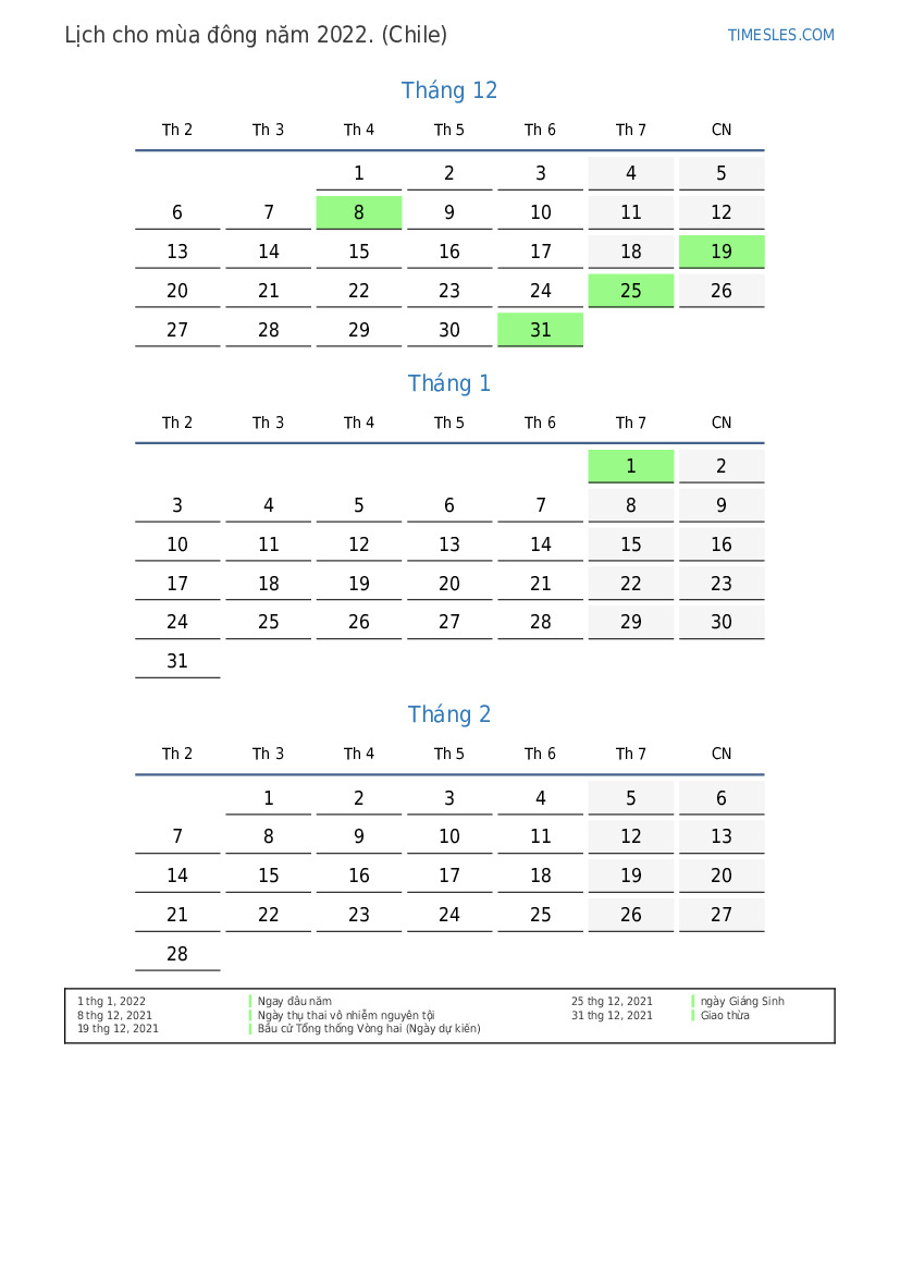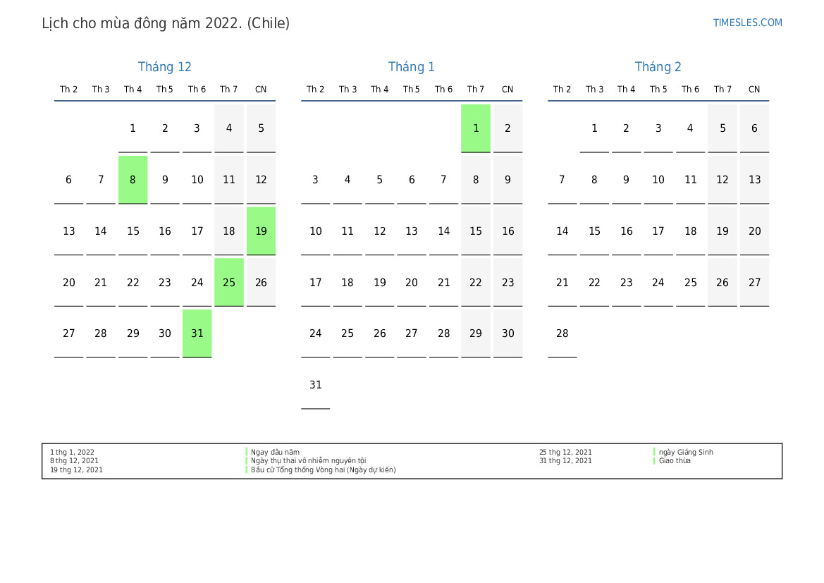 Vào mùa đông năm 2022, có 6 ngày nghỉ và ngày nghỉ trong nước chi Lê. Mùa đông năm 2022 bắt đầu vào thứ Tư và kết thúc vào thứ hai.
