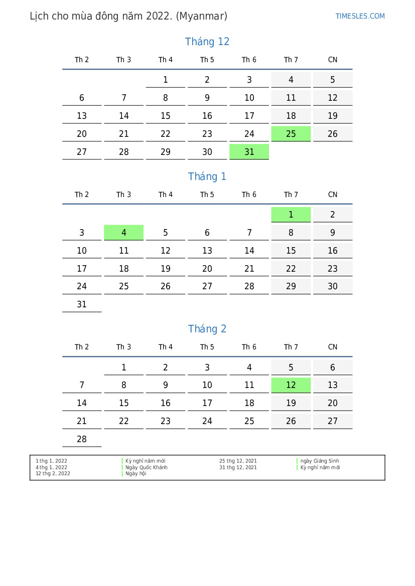 Vào mùa đông năm 2022, có 6 ngày nghỉ và ngày nghỉ ở Myanmar. Mùa đông năm 2022 bắt đầu vào thứ Tư và kết thúc vào thứ hai.