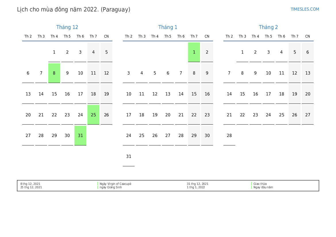 Vào mùa đông năm 2022, có 6 ngày nghỉ và ngày nghỉ ở Paraguay. Mùa đông năm 2022 bắt đầu vào thứ Tư và kết thúc vào thứ hai.