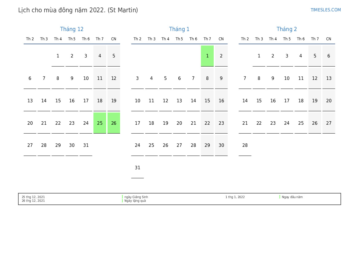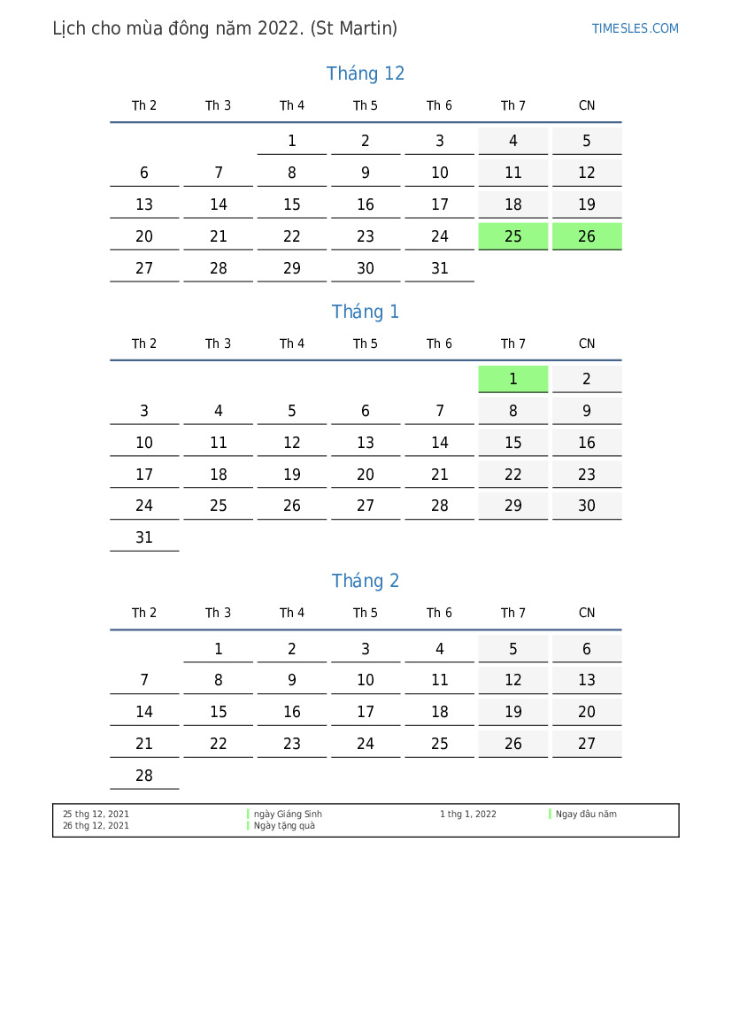 Tải xuống và in lịch PDF với các ngày lễ và cuối tuần cho mùa đông năm 2022 cho Sint Maarten
