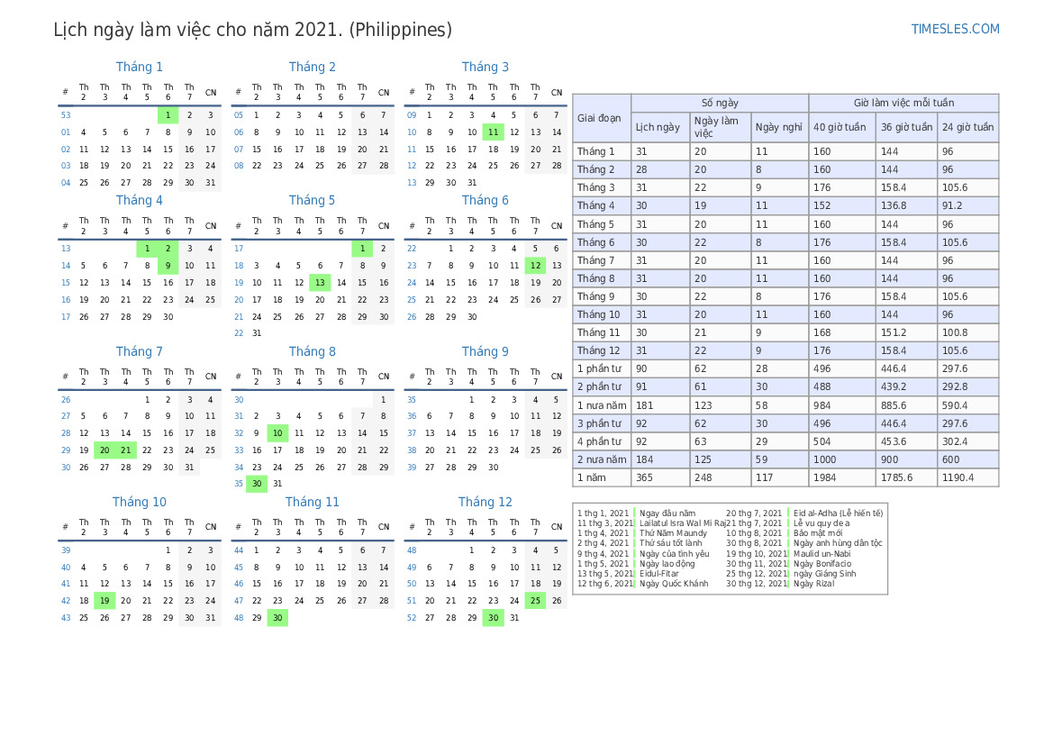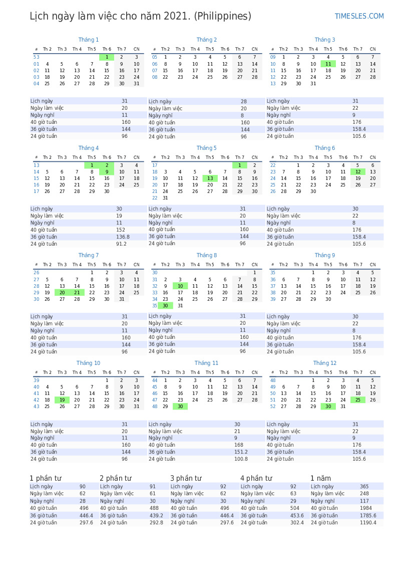 Lịch ngày làm việc cho Tháng 5 năm 2021 cho Philippines