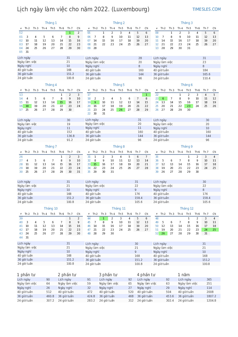 Lịch ngày làm việc cho Tháng 6 năm 2022 cho Luxembourg