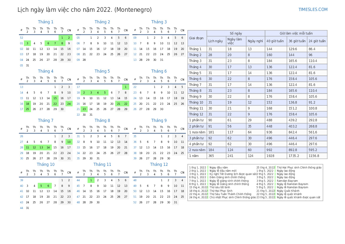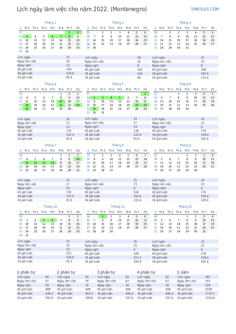 Ngày làm việc cho năm 2022. Có 36 ngày nghỉ và ngày nghỉ ở Montenegro vào năm 2022.