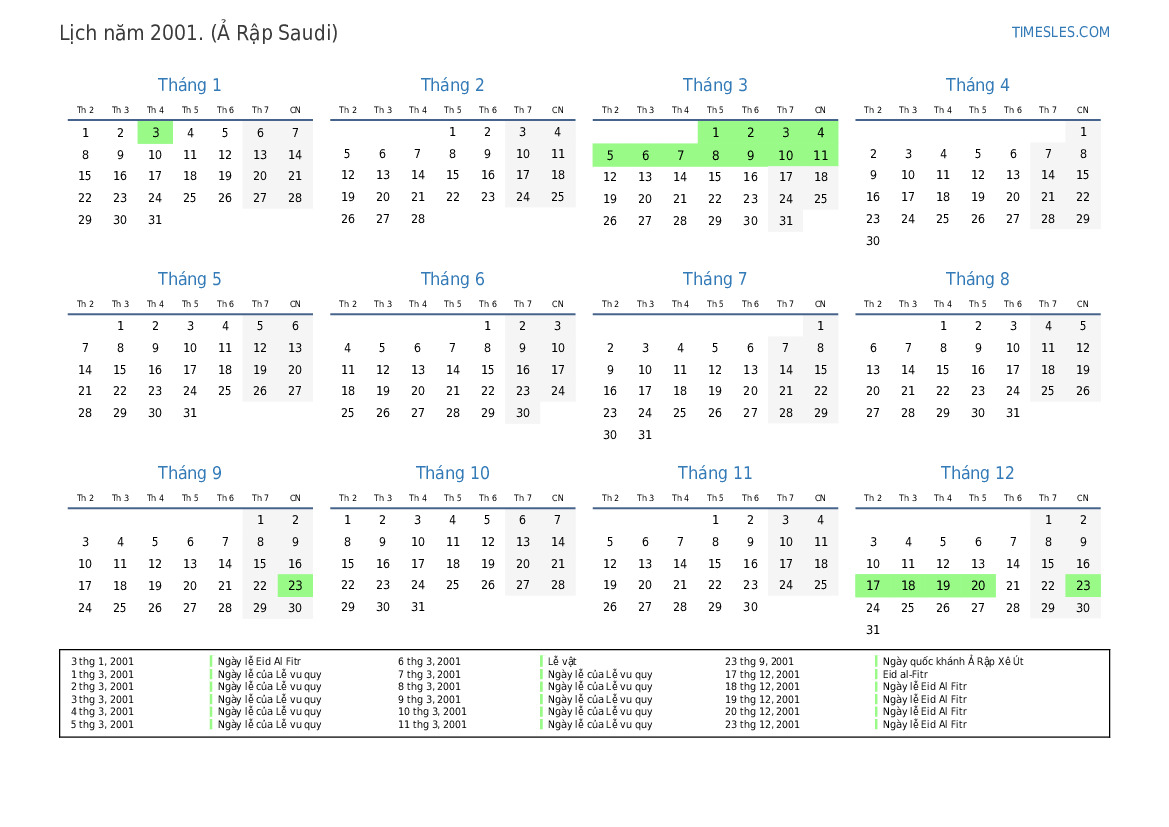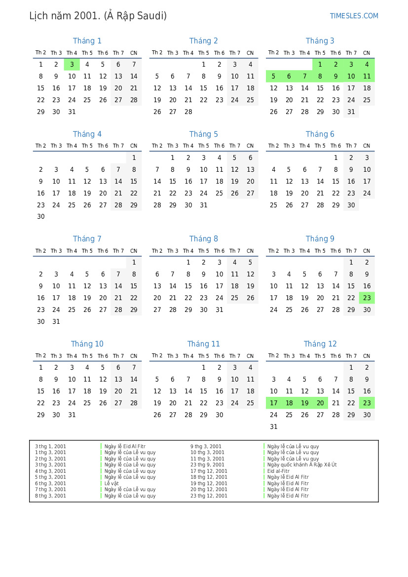 21 thg 12, 2001 Ngày lễ Eid al-Fitr (chỉ dành cho khu vực công)